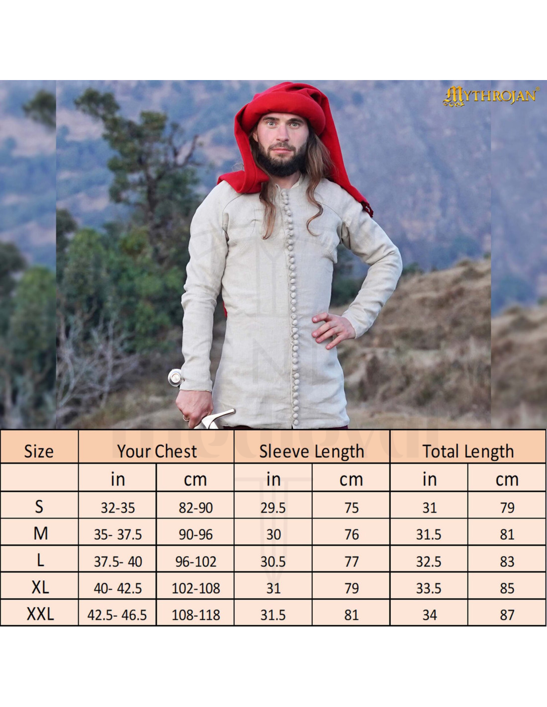 Cada Jubón medieval século XIV em linho natural, século XIV: O nome oficial do produto é confeccionado à mão com técnicas clássicas, por isso podem ser apreciadas leves variações de cor e textura, selo de autenticidade artesanal. Charles de Blois foi uma figura central do século XIV, e portar esta peça conecta diretamente com esse legado histórico.