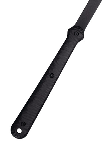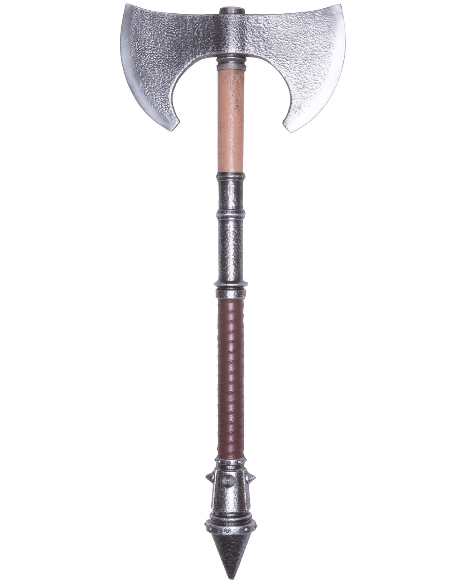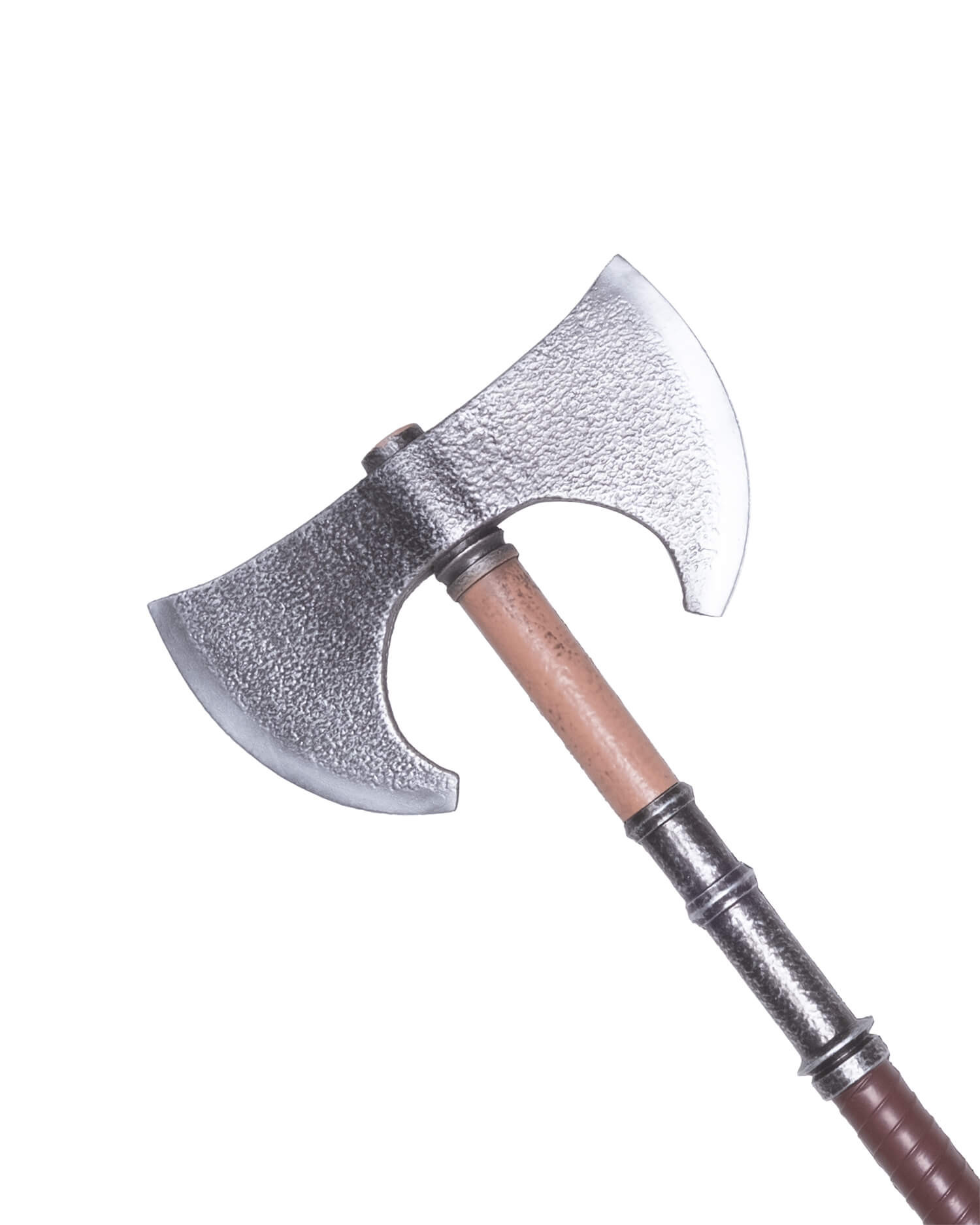 A lâmina dupla simétrica, com textura martelada que lembra o trabalho do metal antigo, oferece um aspecto autêntico que complementa personagens bárbaros, anões ou do norte, enquanto sua silhueta compacta facilita movimentos rápidos e manobras precisas em combate cênico. O cabo apresenta zonas diferenciadas – uma seção superior de tom madeira clara, um trecho central com acabamento rugoso a condizer com a lâmina, e uma empunhadura inferior envolta em padrão estriado – tudo pensado para proporcionar um agarre seguro e controle constante durante longas batalhas.