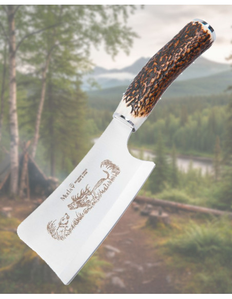 O cabo feito de chifre de cervo mantém a textura e as veias naturais, oferecendo um toque quente e uma pegada firme. Seu formato ligeiramente curvado se adapta à mão, facilitando o controle e reduzindo a fadiga em usos prolongados. A peça metálica entre a lâmina e o cabo reforça a união, criando uma sensação de solidez e segurança a cada movimento.