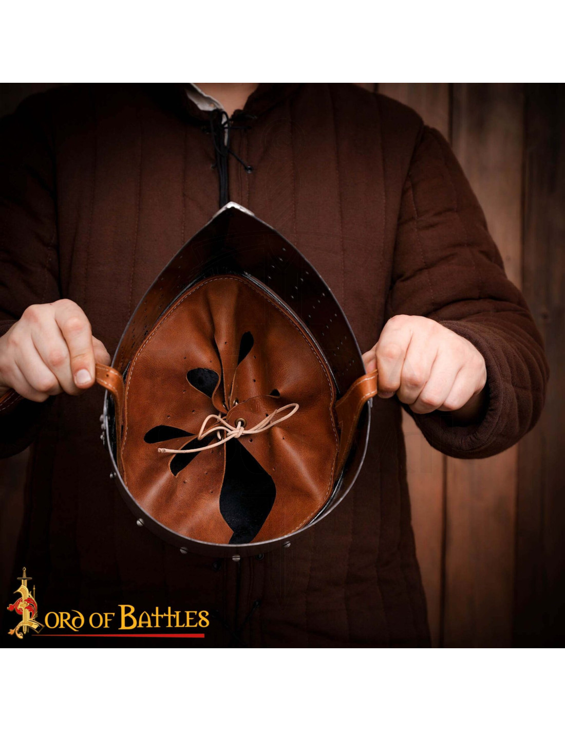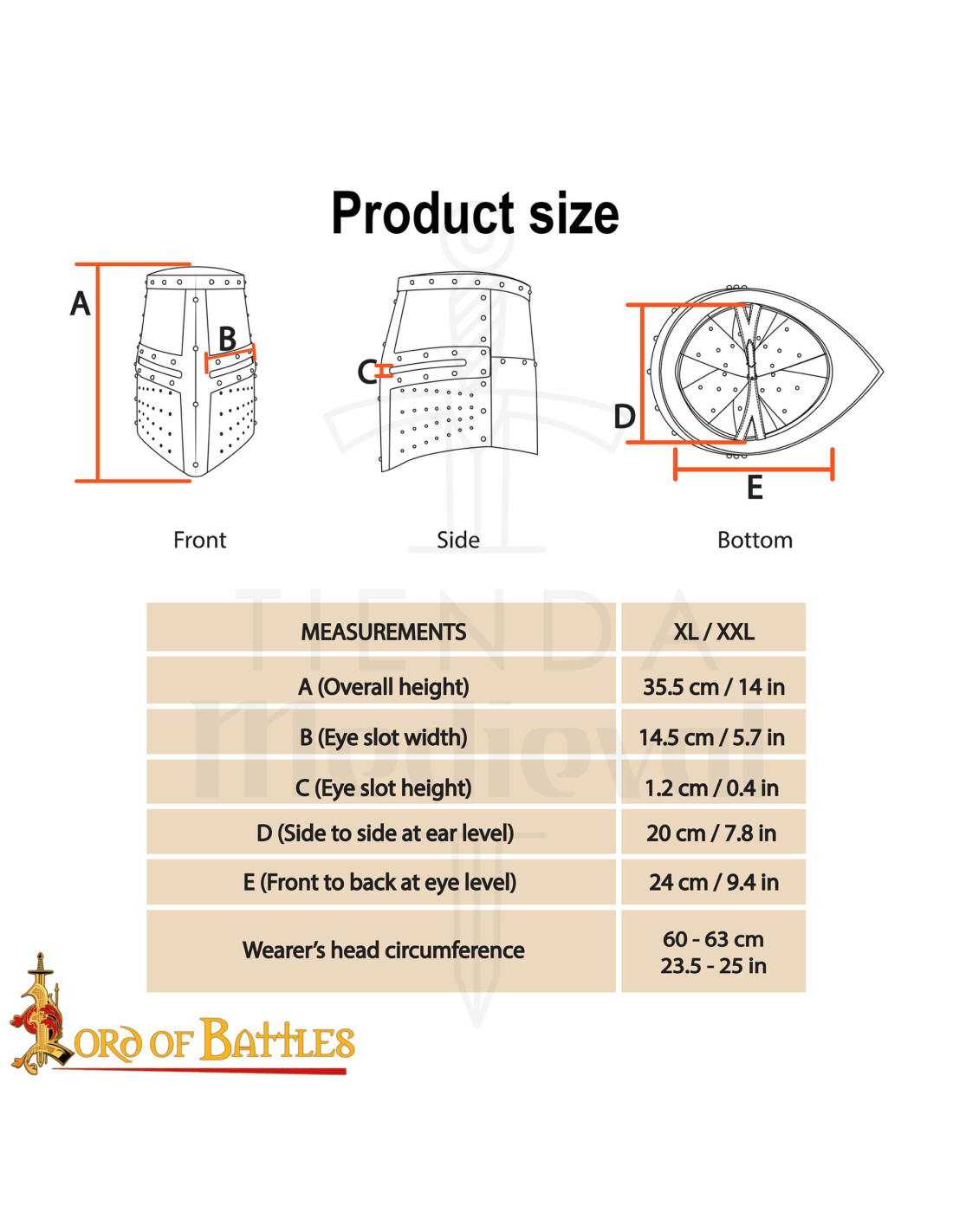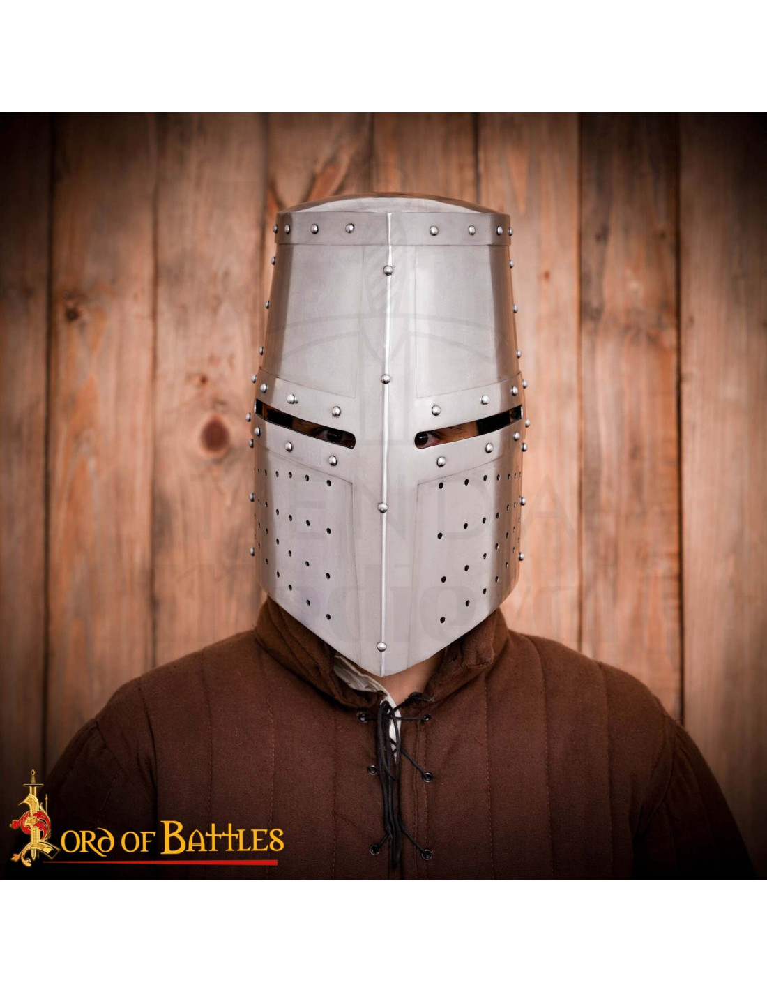 Seu design inspirado nos séculos XIII e XIV cobre completamente a cabeça, com uma estrutura que permite uma visão clara através de suas amplas frestas oculares, com mais de 14 cm de comprimento, e ventilação por meio de perfurações que facilitam o conforto durante o uso. Graças ao seu forro de couro, ajusta-se perfeitamente à sua cabeça, proporcionando conforto e absorvendo os golpes no combate, além de facilitar o alinhamento da visão.