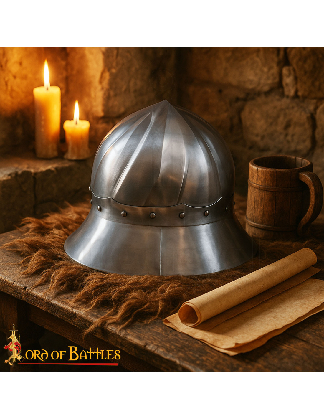 Colocado sobre um suporte rústico com velas e pergaminhos, o capacete projeta uma estética fiel à sua origem nos Países Baixos burgundianos, evocando as fileiras de piqueteiros e arqueiros que o usaram por sua capacidade de desviar golpes e projéteis. É perfeito tanto para exibição em museus e eventos de patrimônio, quanto para aqueles que desejam comprar uma reprodução robusta e com presença histórica.
