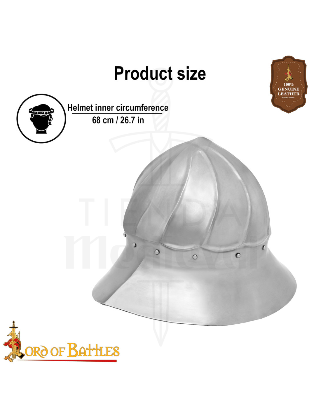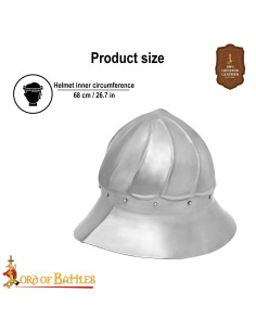 Este capacete evoca as linhas dos séculos XV, oferecendo proteção eficaz contra impactos verticais graças à sua aba pronunciada e seu fundo profundo, permitindo que você se mova e observe o entorno sem sacrificar a visibilidade. O acabamento polido e as nervuras que convergem na coroa proporcionam um apelo visual intenso, tornando-o o centro de qualquer coleção ou demonstração.