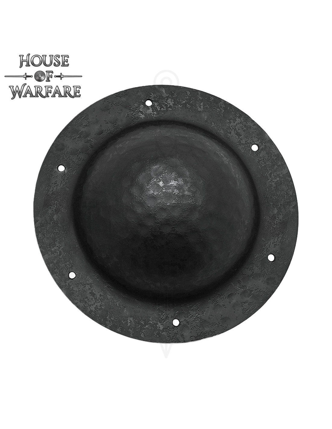 Este umbo forjado à mão oferece uma sensação de solidez e autenticidade, graças ao seu aço trabalhado com martelo que aporta uma textura áspera e um acabamento mate escuro, ideal para quem busca um aspecto sóbrio e funcional. O tratamento negro não só acentua seu aspecto histórico, mas ajuda a proteger a peça contra o desgaste, mantendo-a pronta para uso em recriações ou exibições.