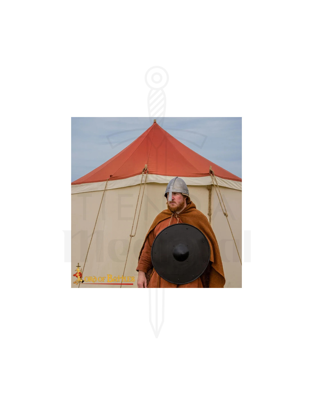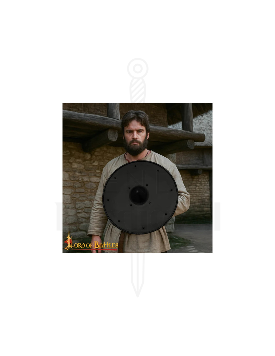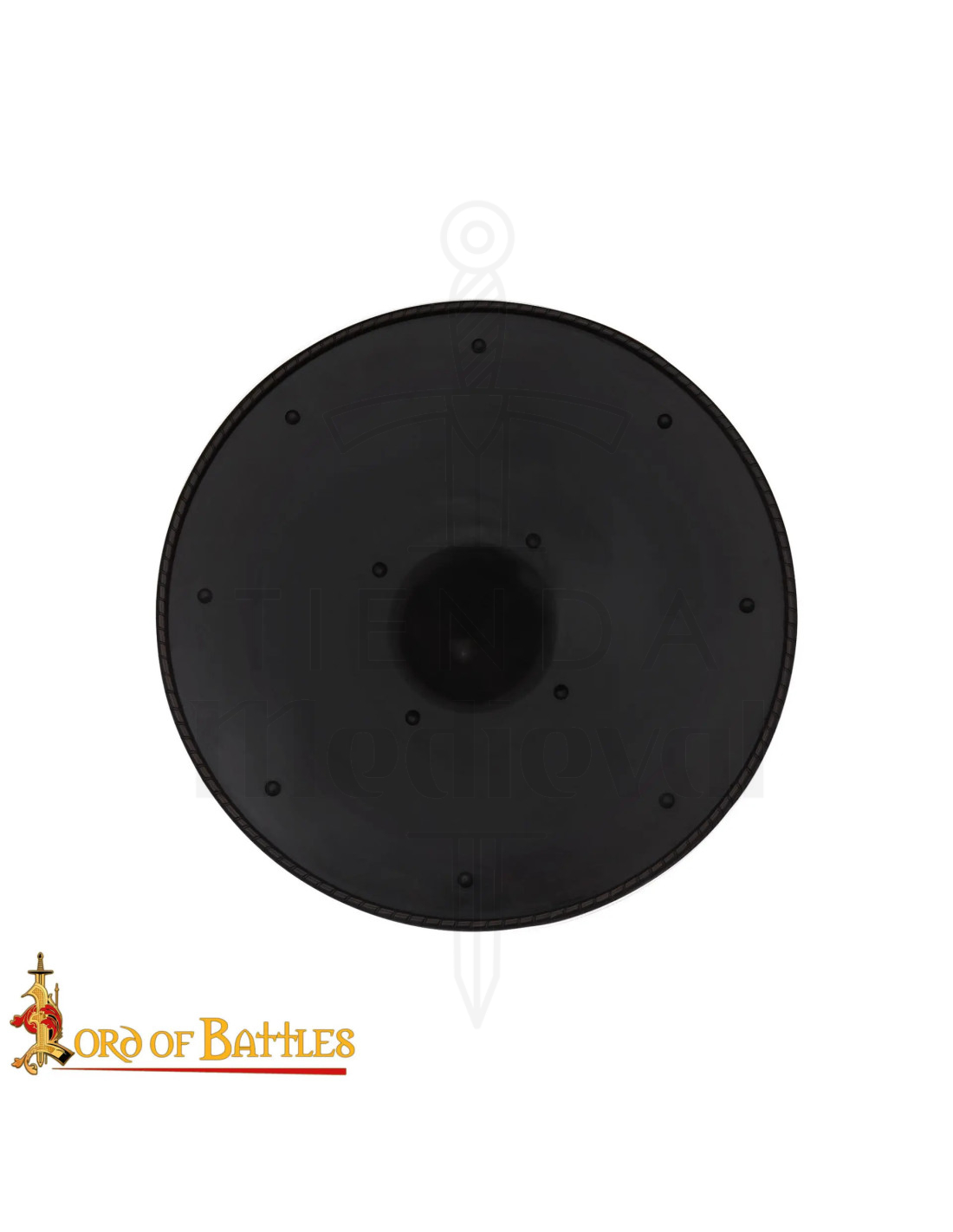 Forjado à mão em aço, este Escudo Viking oferece uma sensação autêntica e uma resposta sólida ao impacto, sem renunciar à manobrabilidade necessária para movimentos precisos. Seu acabamento natural e sua superfície lisa em cor preta com rebites visíveis transmitem essa estética guerreira que você procura, enquanto a borda texturizada atua como amortecedor contra golpes, preservando a integridade do escudo e de quem o manobra. O golpe central em forma de protuberância não só define seu aspecto clássico, mas também protege a mão e permite posições de defesa mais seguras.