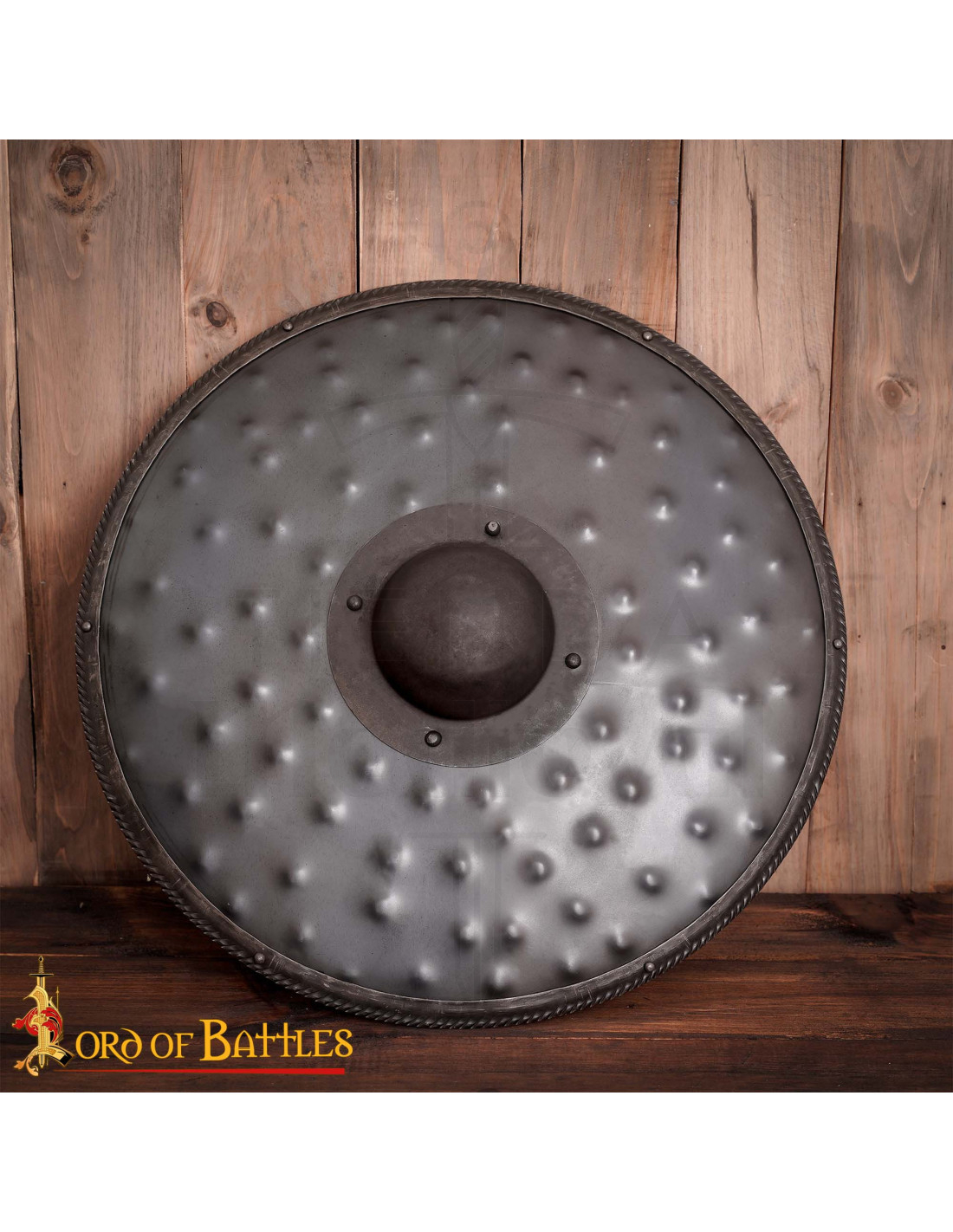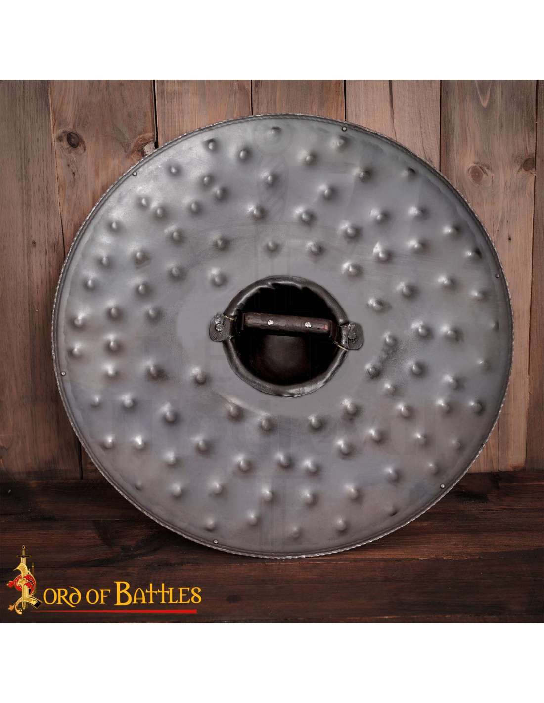 O design inclui um umbo central reforçado e rebites visíveis, que além de agregar caráter, oferecem uma proteção prática para a mão, enquanto a borda reforçada aumenta a resistência contra impactos, tornando-o ideal para combates de LARP e performances em cena onde a segurança e a credibilidade são essenciais.