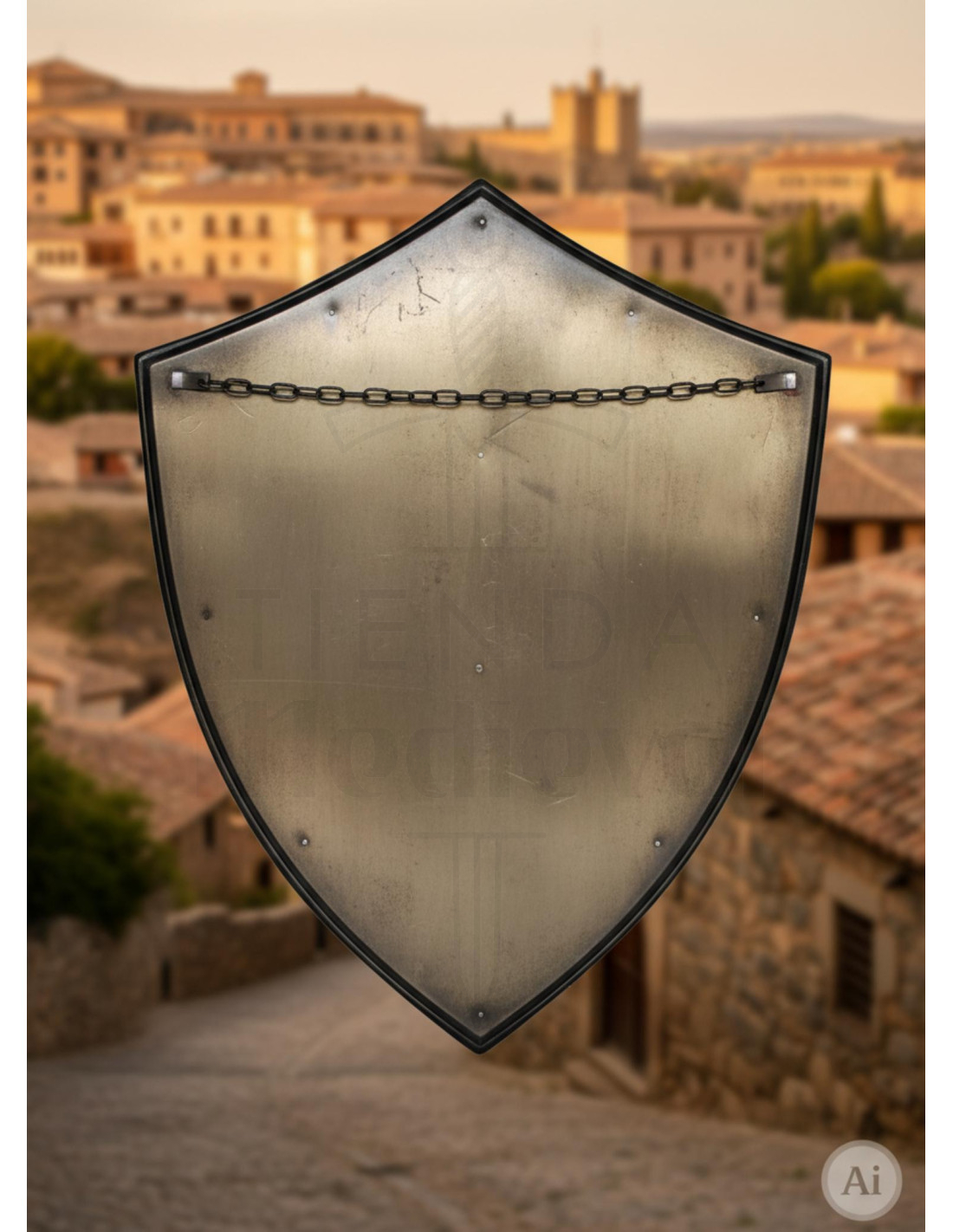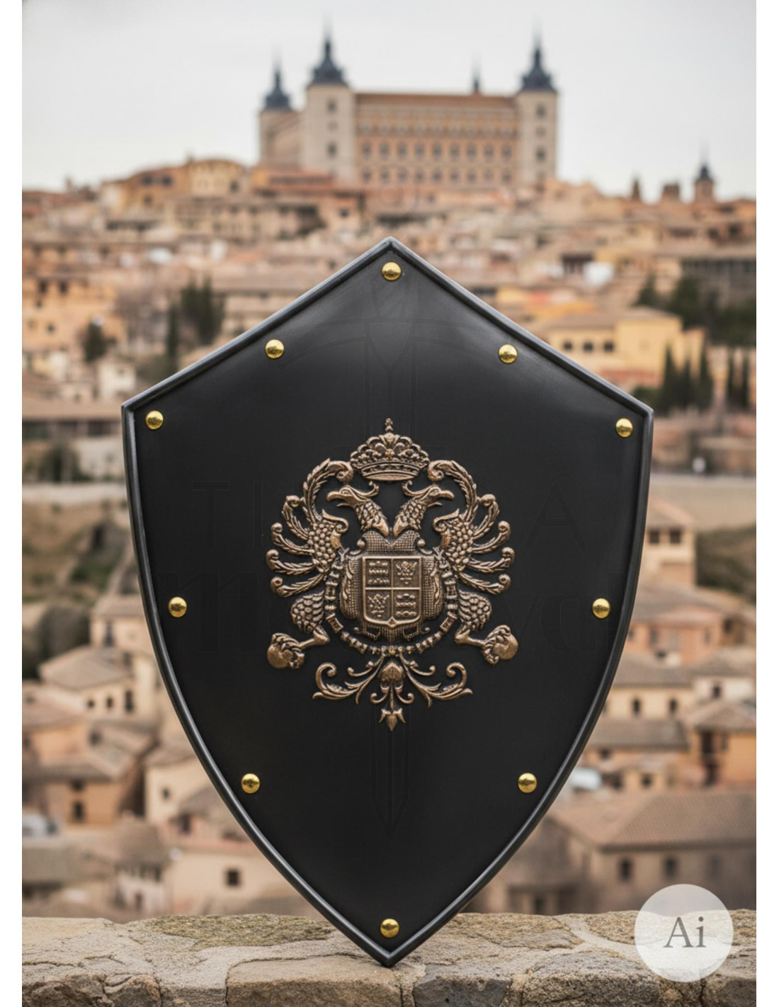 Além disso, este escudo foi fabricado em Toledo, na Espanha, reconhecida mundialmente por sua tradição na fabricação de armas e armaduras. Isso garante sua autenticidade e qualidade.