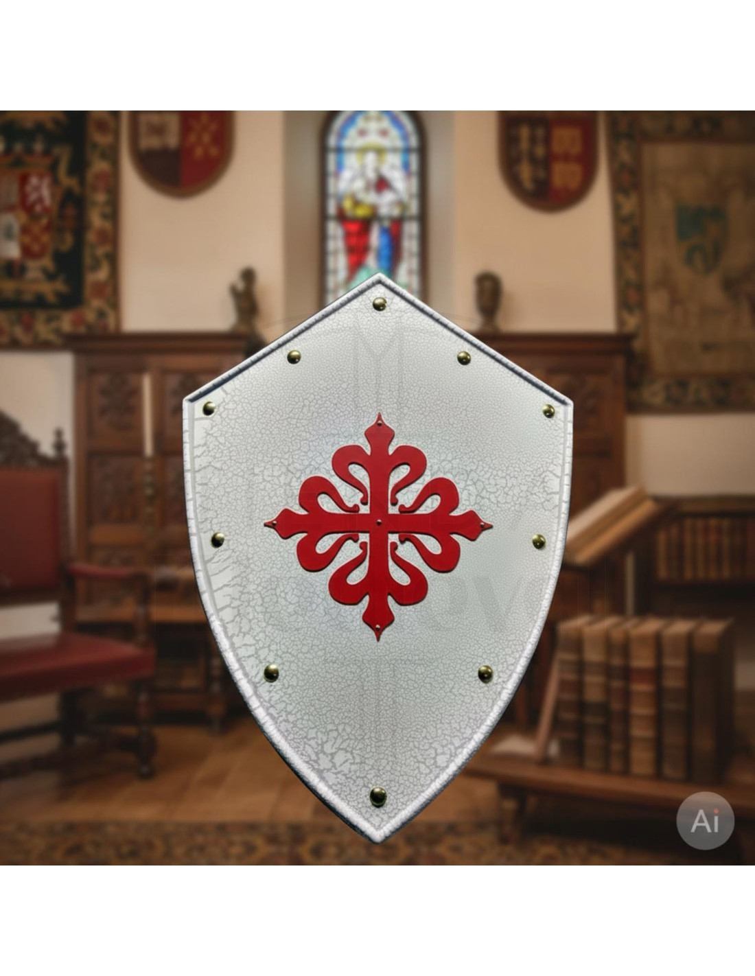 Descubra o Escudo Cruzado Calatravos Knights, uma peça única e exclusiva que não pode faltar na sua coleção! Este escudo é feito de chapa de ferro de alta qualidade e foi decorado à mão com a técnica Craquelé, o que lhe confere uma aparência autêntica e cheia de história.