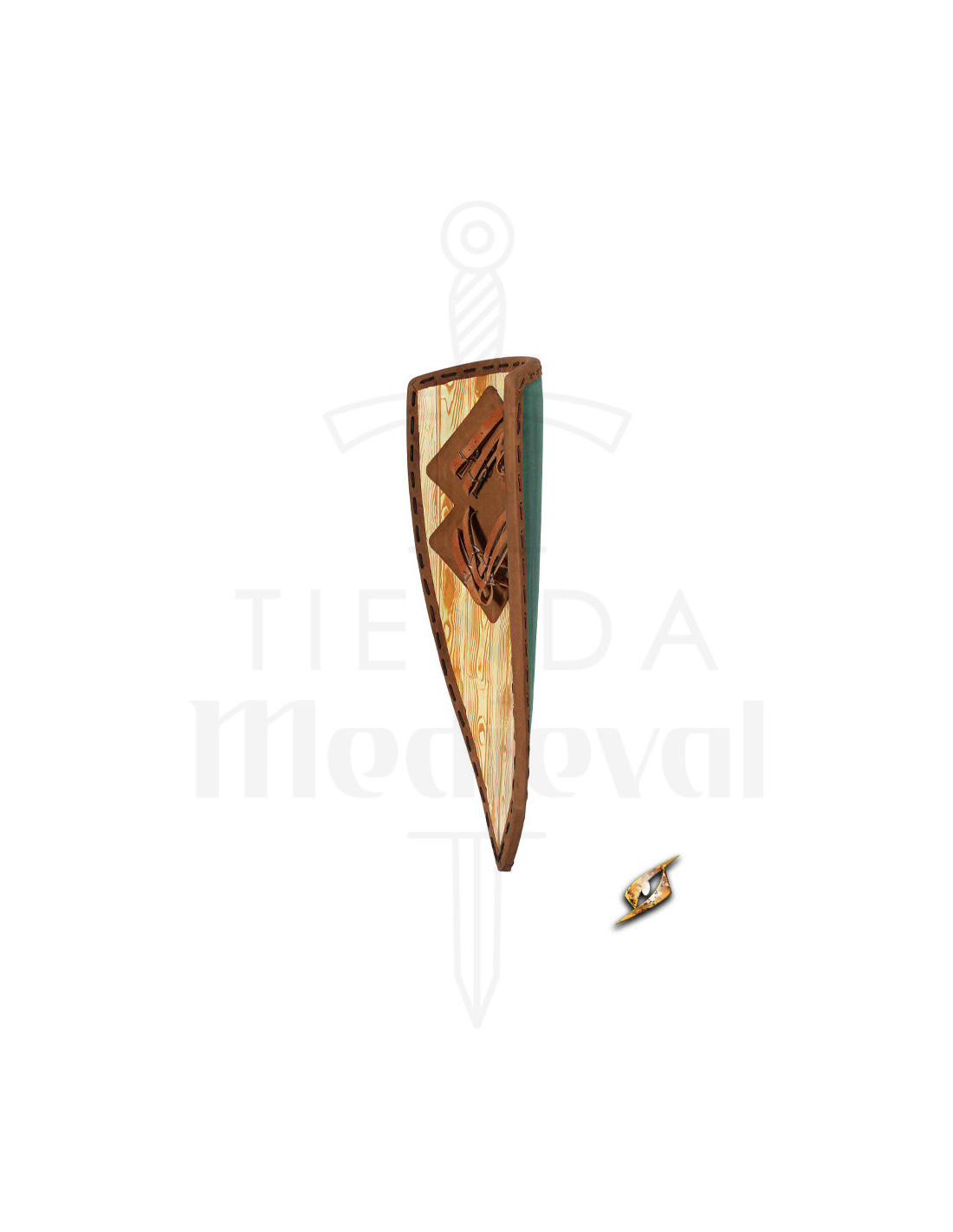 Com um design inspirado nos escudos de guerra do Alto Médioevo, sua estrutura em espuma EVA moldada e pintada à mão simula a aparência de madeira envelhecida, oferecendo um visual autêntico e resistente. A superfície texturizada, com acabamento fosco, proporciona um aspecto desgastado e realista, perfeito para acrescentar caráter ao seu traje.