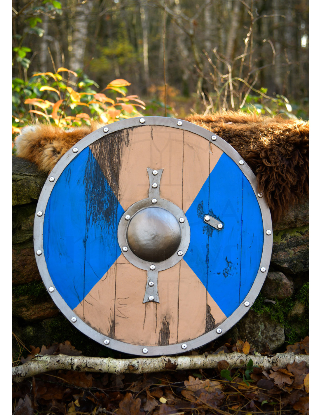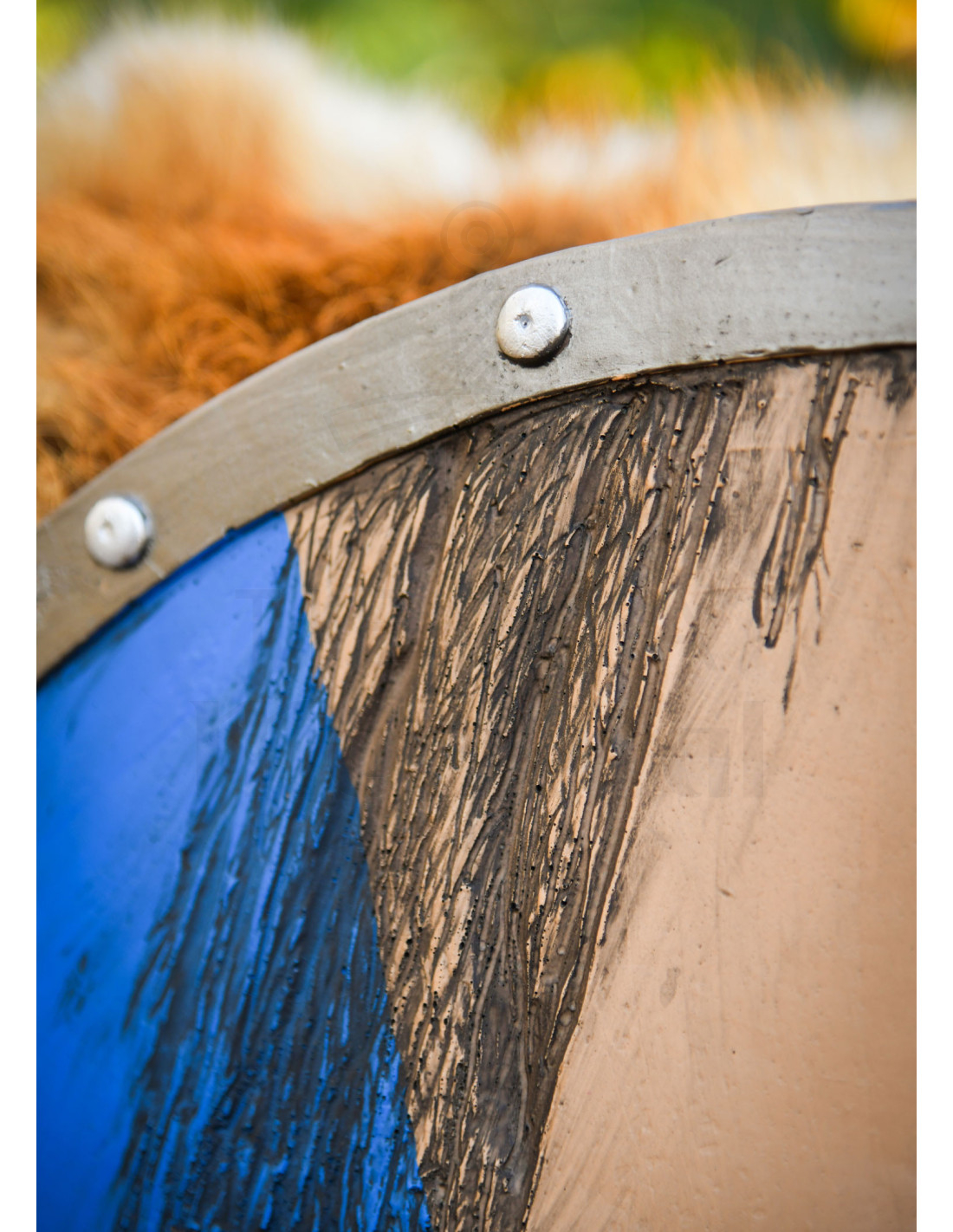 A estética rústica e os veios visíveis dão-lhe a aparência de madeira envelhecida, enquanto o acabamento em tons de azul e bege, dividido em quatro seções, confere caráter e presença a qualquer cena. A borda metálica com rebites e o protetor central abombado reforçam a impressão de um equipamento forjado para o combate, sem comprometer a segurança e a leveza que você precisa na ação.