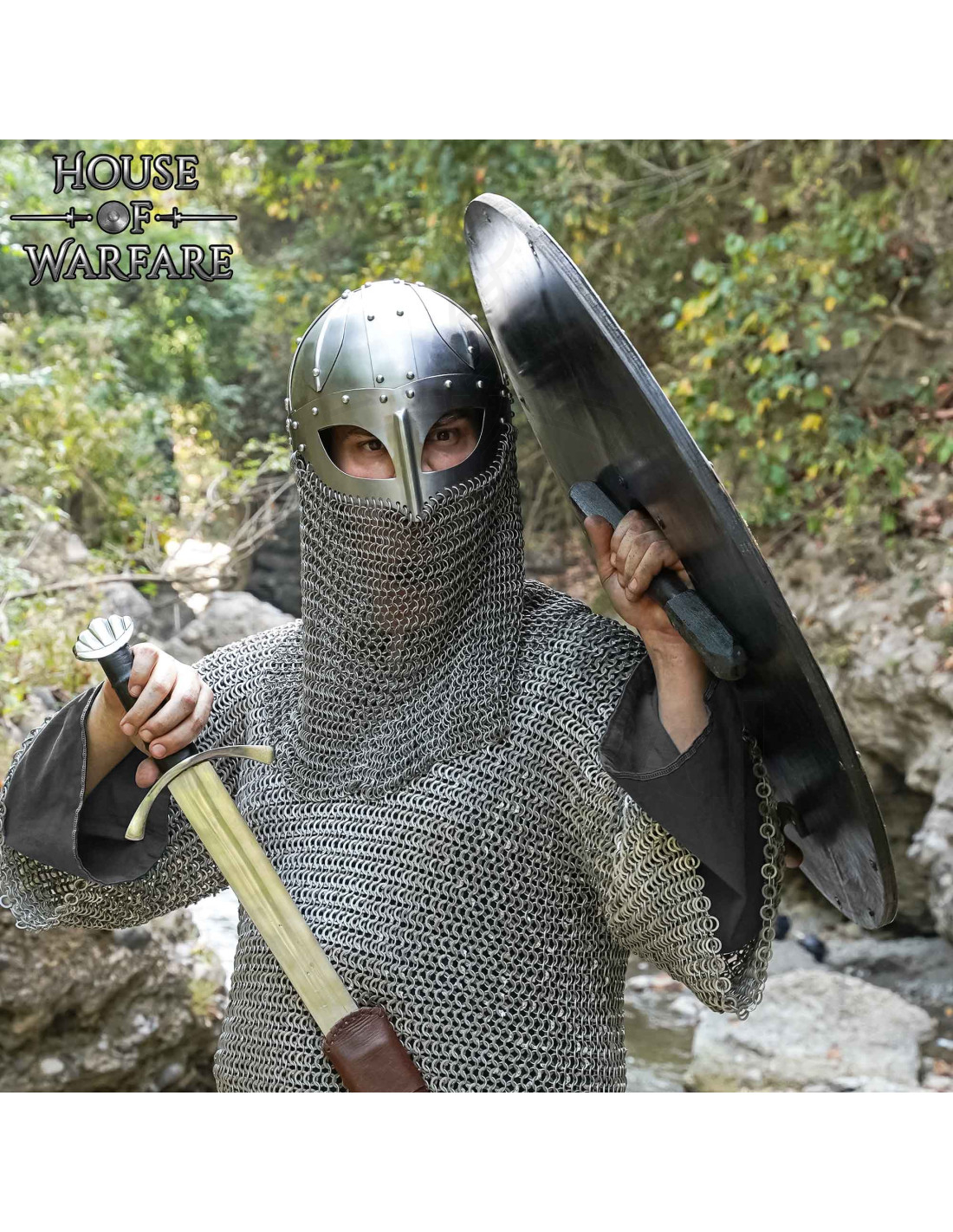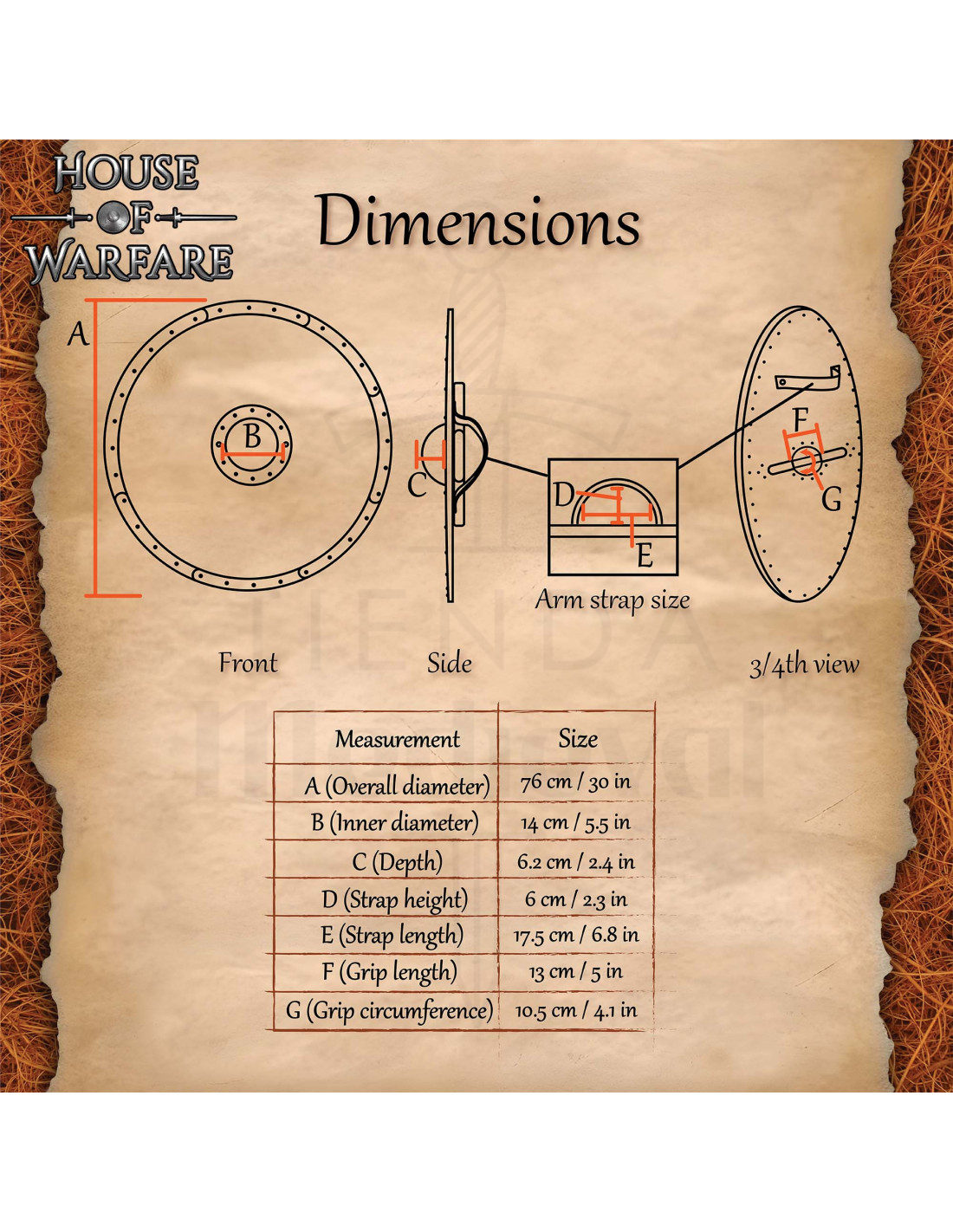 Construído para durar, sua fabricação em madeira maciça proporciona uma sensação sólida ao toque e resistência aos usos habituais em LARP ou teatro, enquanto a borda metálica fixada com rebites aumenta a durabilidade frente a impactos, mantendo o design fiel a referências históricas.