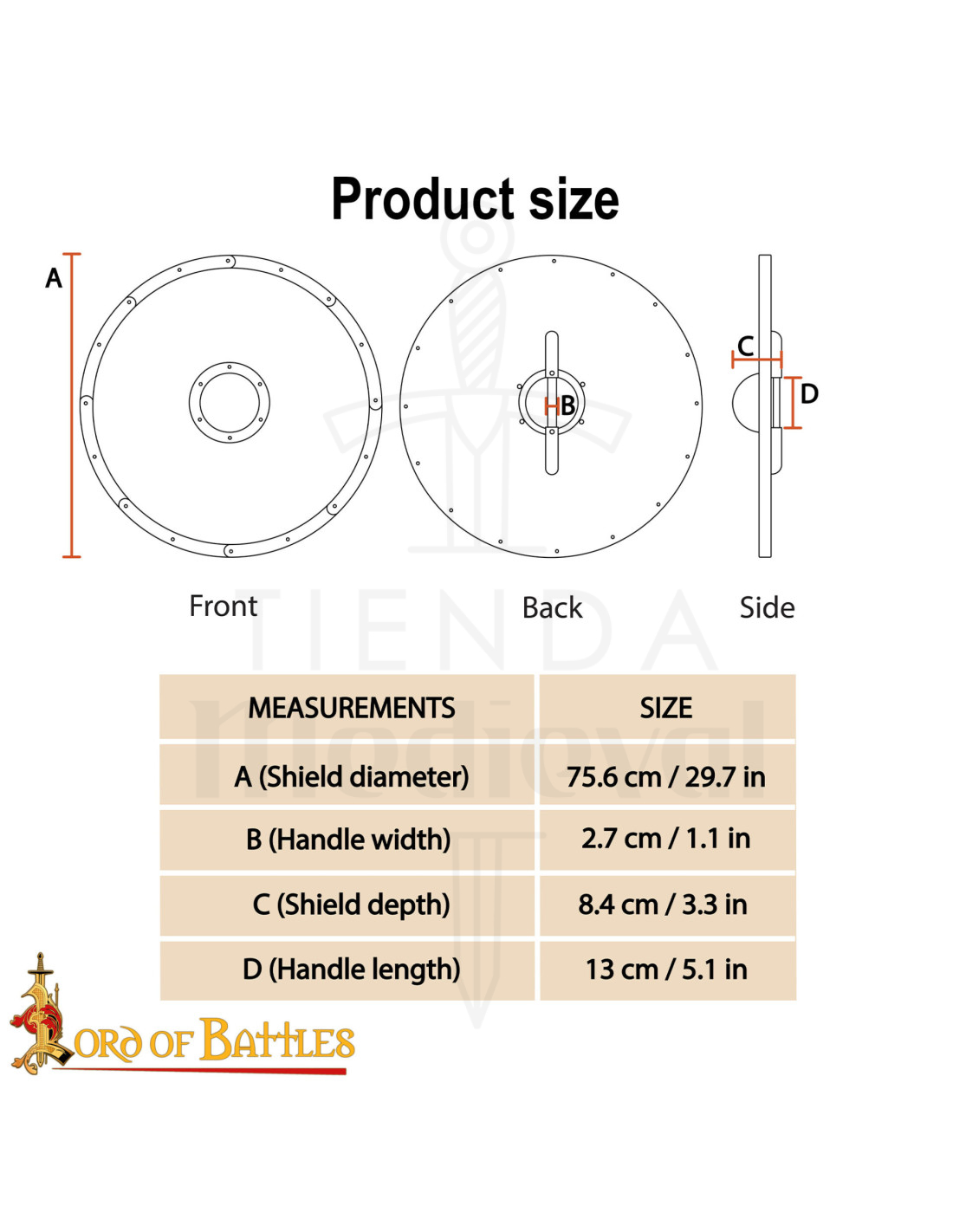 O design pintado à mão, dividido em quatro setores alternados em preto e vermelho, não apenas proporciona uma aparência intimidadora e autêntica, mas também reflete uma estética historicamente informada que realça qualquer recriação ou exposição. A borda metálica com rebites visíveis assegura a união entre os materiais, enquanto o elemento metálico central bombado, fixado com rebites, reforça os golpes de empuxo e protege a mão no centro do escudo.