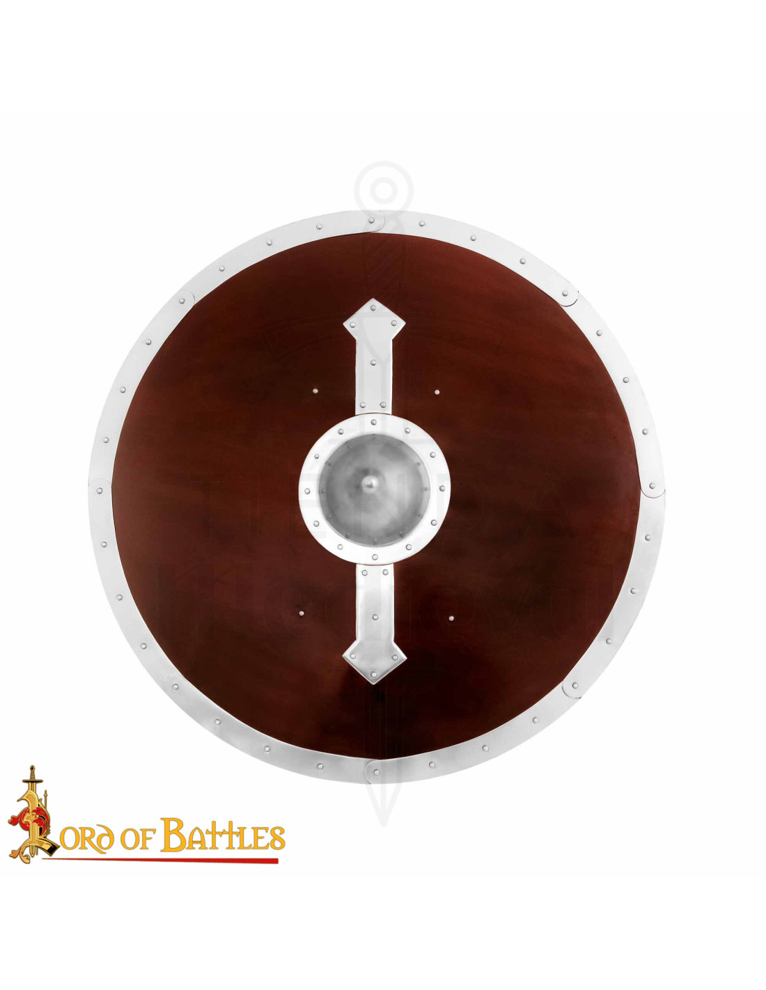 A construção artesanal em madeira sólida, reforçada com uma faixa metálica rebitada e um umbo convexo central, significa que você tem um suporte confiável para praticar manobras e absorver impactos em recriações e LARP, sem abrir mão de uma aparência fiel à história. A peça metálica vertical com extremidades pontiagudas que atravessa a frente não só reforça a estrutura, mas também realça a estética guerreira, criando um motivo visual impactante.