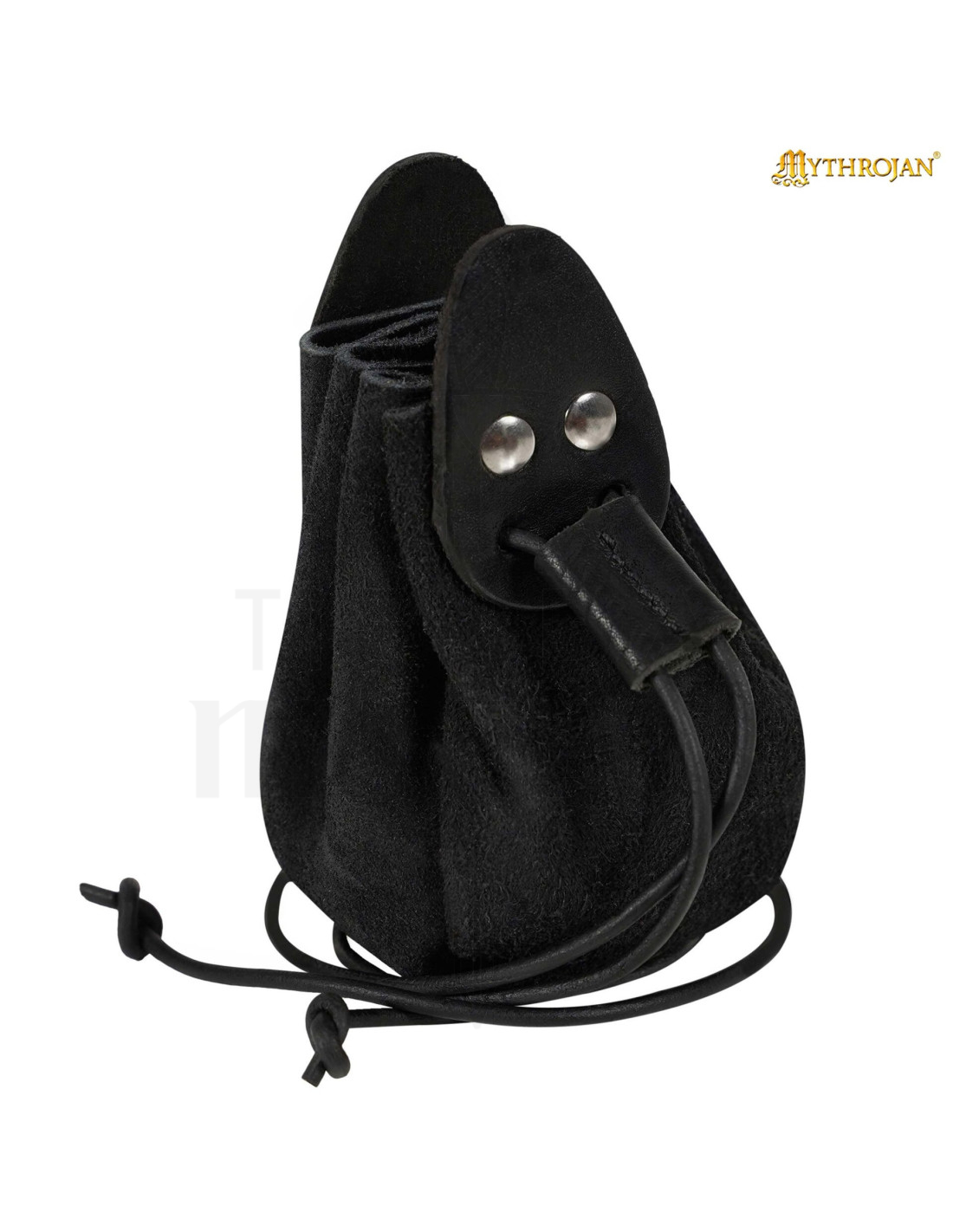 Esta bolsa preta de camurça oferece uma sensação suave ao toque e uma flexibilidade que facilita guardá-la ou retirá-la com uma só mão, mantendo ao mesmo tempo a resistência necessária para uso frequente. O reforço superior em couro com rebites prateados garante que o fecho por cordão se mantenha firme, para que suas moedas, dados ou objetos pessoais estejam sempre acessíveis, mas seguros.