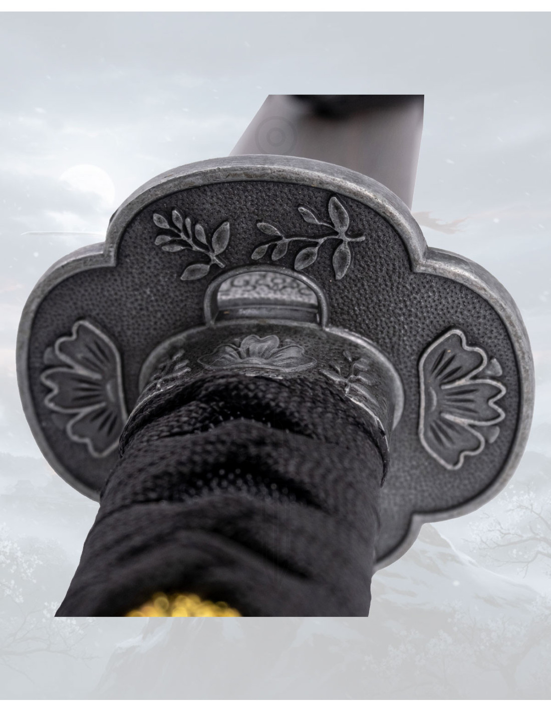 O cabo, envolto em um tecido preto entrelaçado, garante uma pegada segura e confortável, pensado para manobrá-la com soltura ao manipulá-la. Os símbolos dourados presentes no envoltório adicionam um toque de distinção, criando contraste e personalidade sem perder a sobriedade do conjunto. A guarda de tom escuro, com gravações em relevo e design simples, emoldura a peça com discrição e caráter.