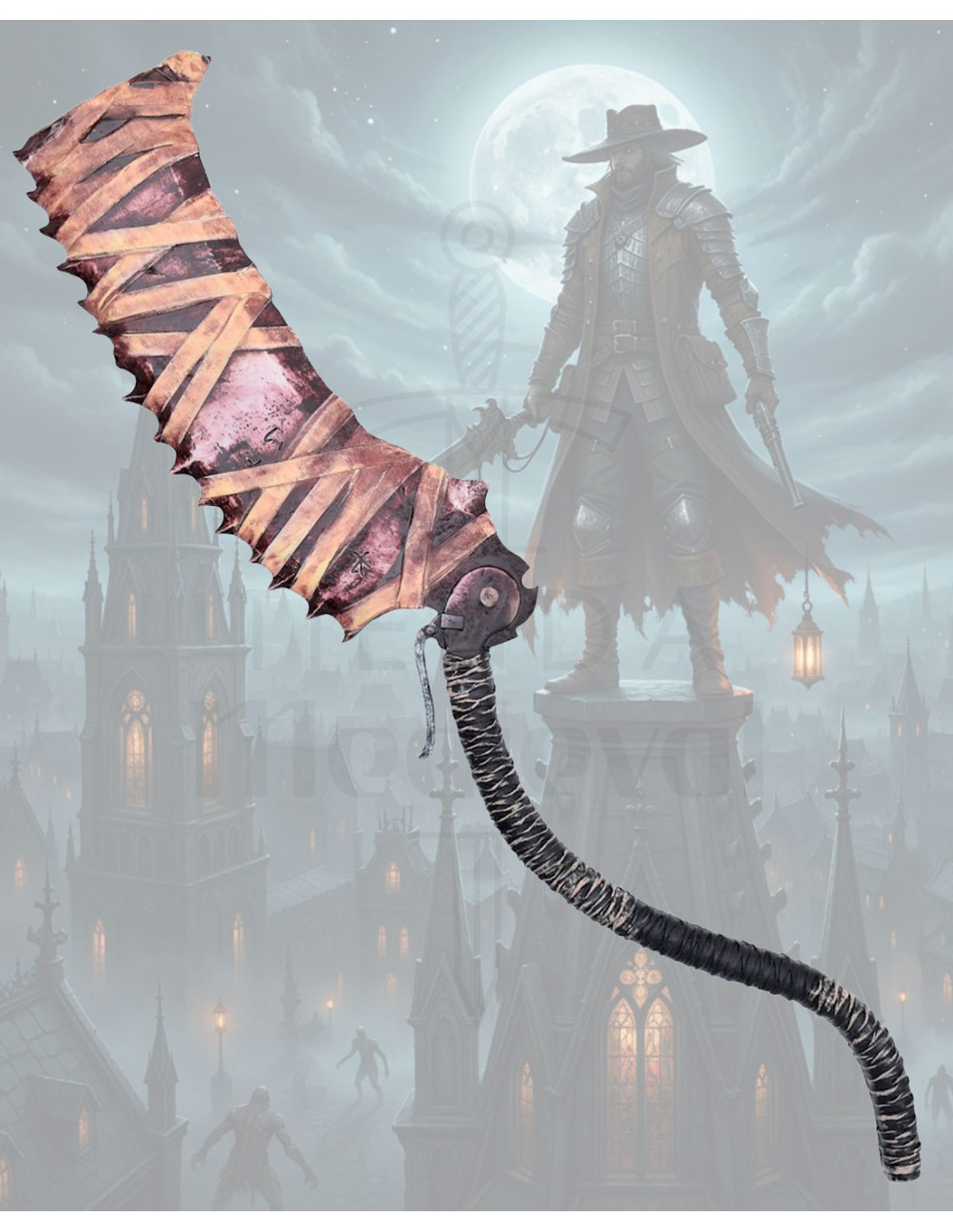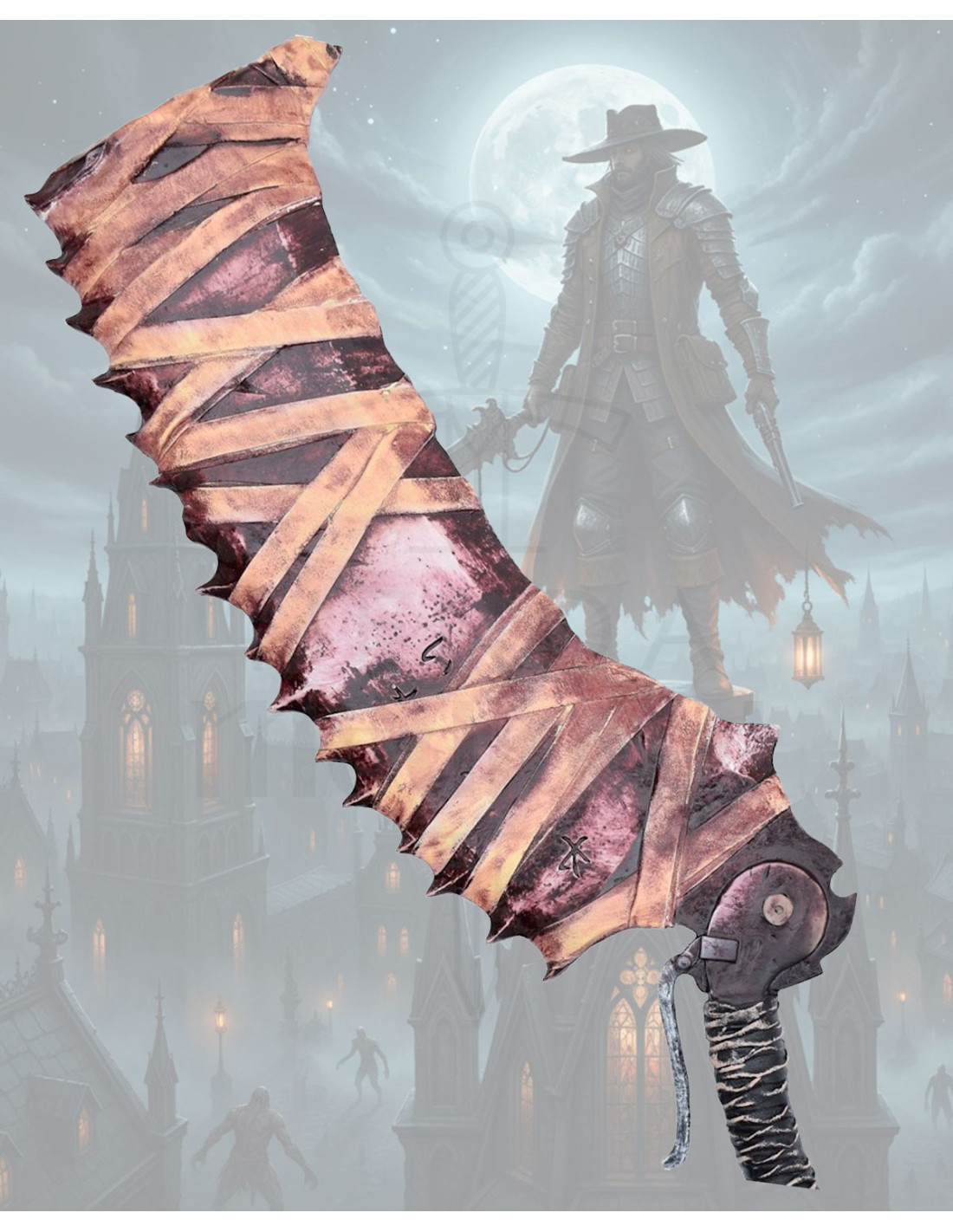 A lâmina ampla e curva, com uma borda superior irregular e serrilhada, contribui para esse acabamento agressivo que chama a atenção de longe, e o design que simula tiras bege envolvendo a lâmina acrescenta uma textura narrativa, como se cada golpe escondesse histórias. O acabamento envelhecido, com tons marrons e manchas, reforça o caráter macabro e artesanal, perfeito para exposições temáticas ou sessões fotográficas.