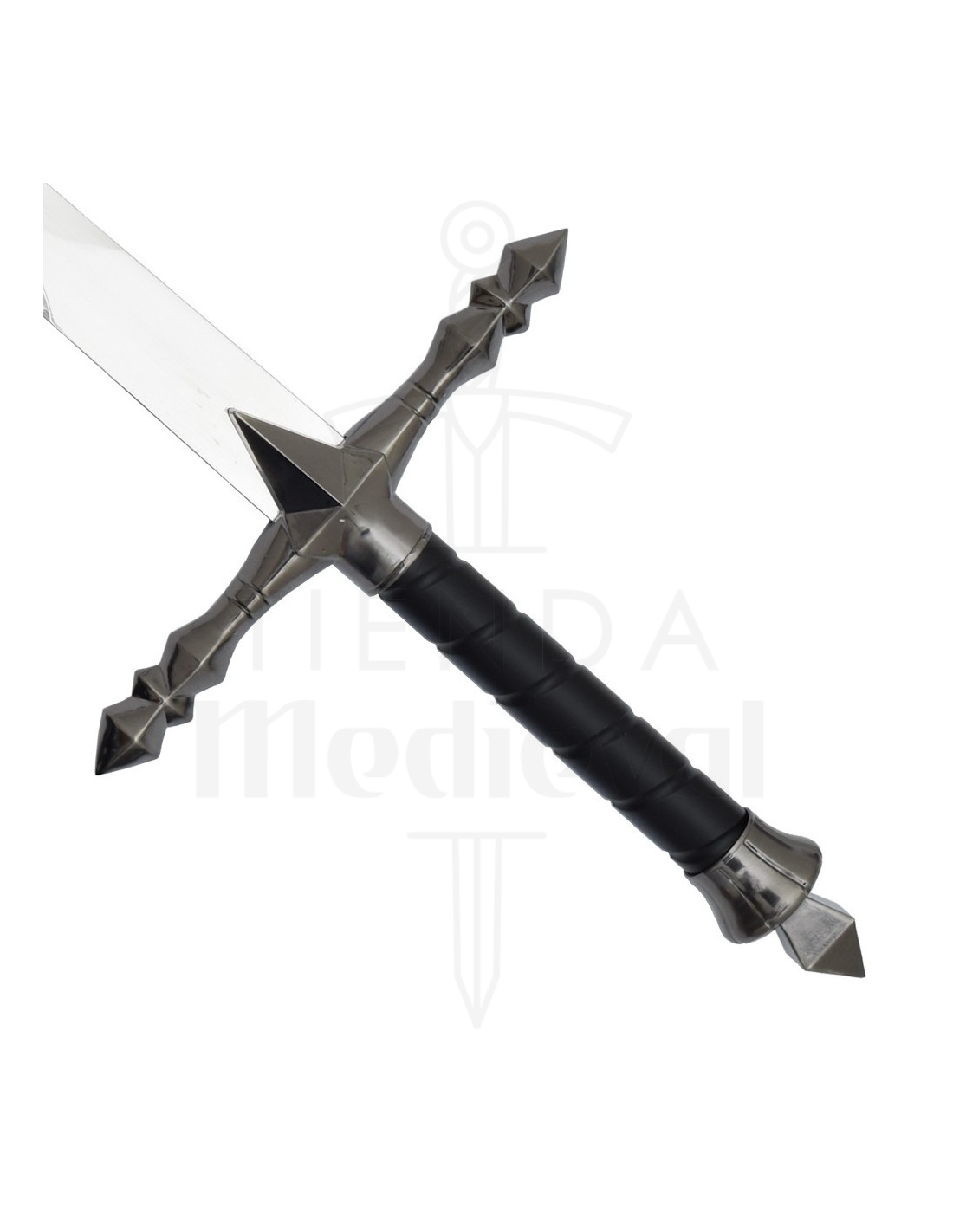 A combinação da lâmina metálica brilhante com a empunhadura de madeira escura oferece uma presença que parece real e cuidadosa, enquanto a textura estriada do cabo facilita um agarre confortável, mesmo que seu destino principal seja a exibição. A guarda e o pomo em metal, com detalhes em forma de losango, adicionam um ponto de autoridade, sem sacrificar a elegância, para quem busca uma réplica com caráter.