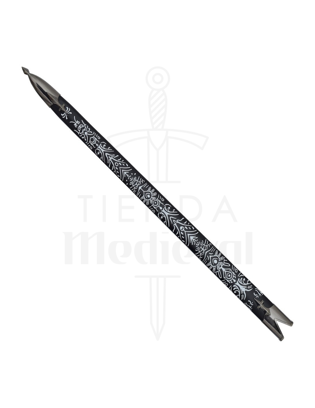 A bainha em madeira, decorada com um motivo branco de estilo tribal e acabamentos metálicos escuros, protege a peça e funciona como um complemento estético, criando um contraste visual que atrai olhares. O suporte de parede incluído facilita montá-la e mudar sua localização rapidamente, permitindo que você a exiba como um centro decorativo sem complicações. O suporte fosco com um emblema vermelho estilizado acentua a ambientação, formando um conjunto harmônico e com identidade própria.