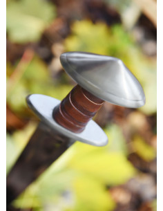 - Pomo de duas partes: Seguindo o desenho de muitas espadas históricas, o pomo triangular é uma construção de duas partes. A espiga completa da lâmina é ancorada na seção inferior e a tampa do pomo é fixada à base por dois rebites. Isso não apenas fornece estabilidade, mas também adiciona autenticidade.