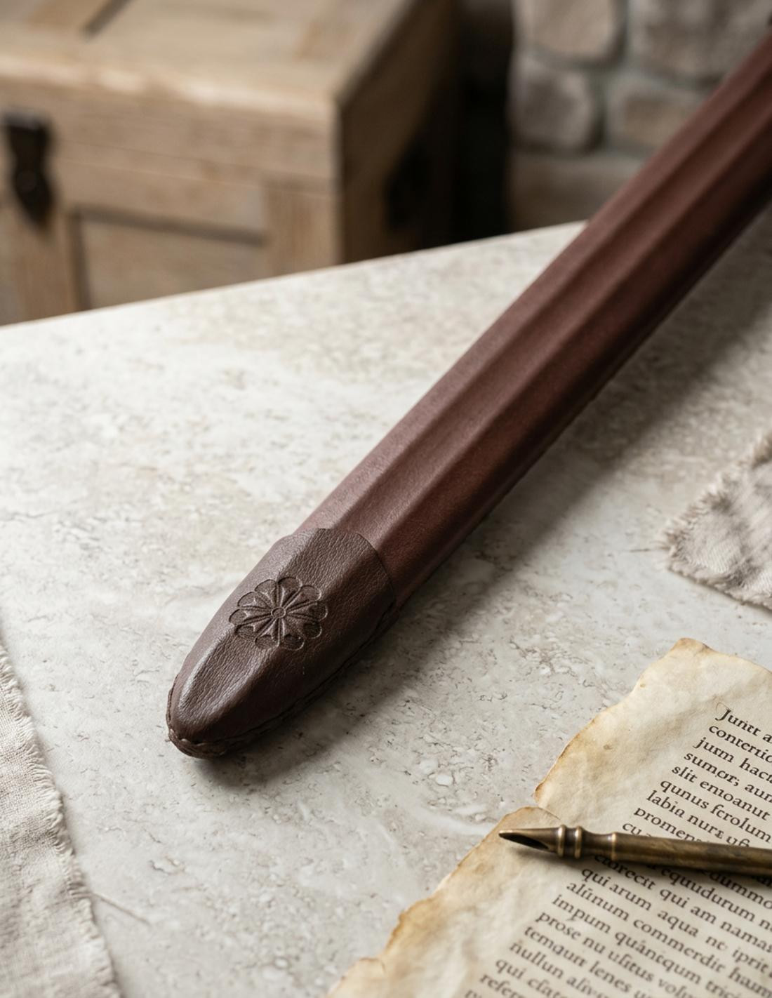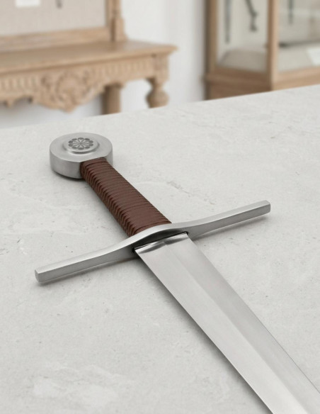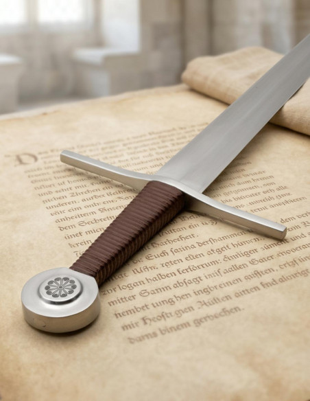 A empunhadura, trabalhada com a técnica histórica de envoltório úmido, oferece uma textura marcada e um agarre seguro, pensado para que sua mão permaneça firme sem recorrer a gestos forçados. O pomo de roda com motivo floral aporta um detalhe clássico, enquanto a guarda reta assegura proteção simples e funcional em cada manuseio.