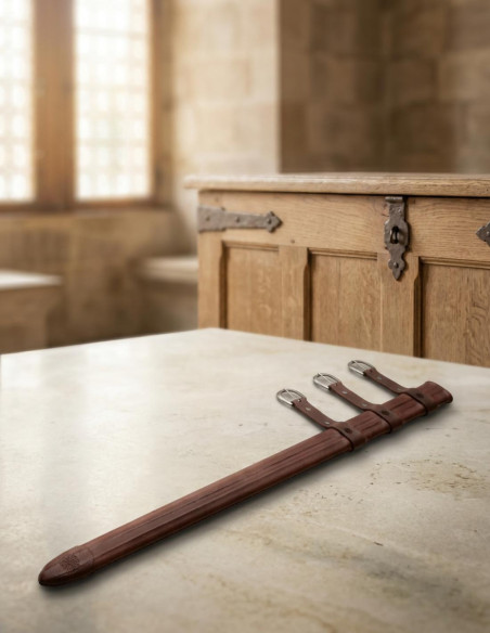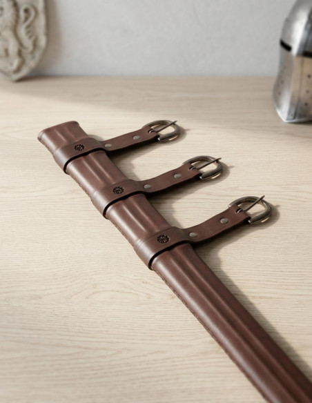 A bainha, revestida em couro sobre um núcleo de madeira, protege a lâmina e permite um desembainado silencioso e controlado. As três correias ajustáveis e o cinto combinado facilitam levá-la com conforto ou exibi-la em uma coleção, mantendo a funda bem presa e alinhada.