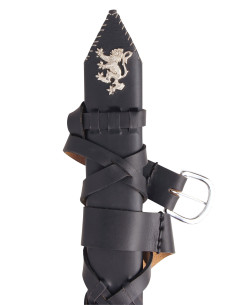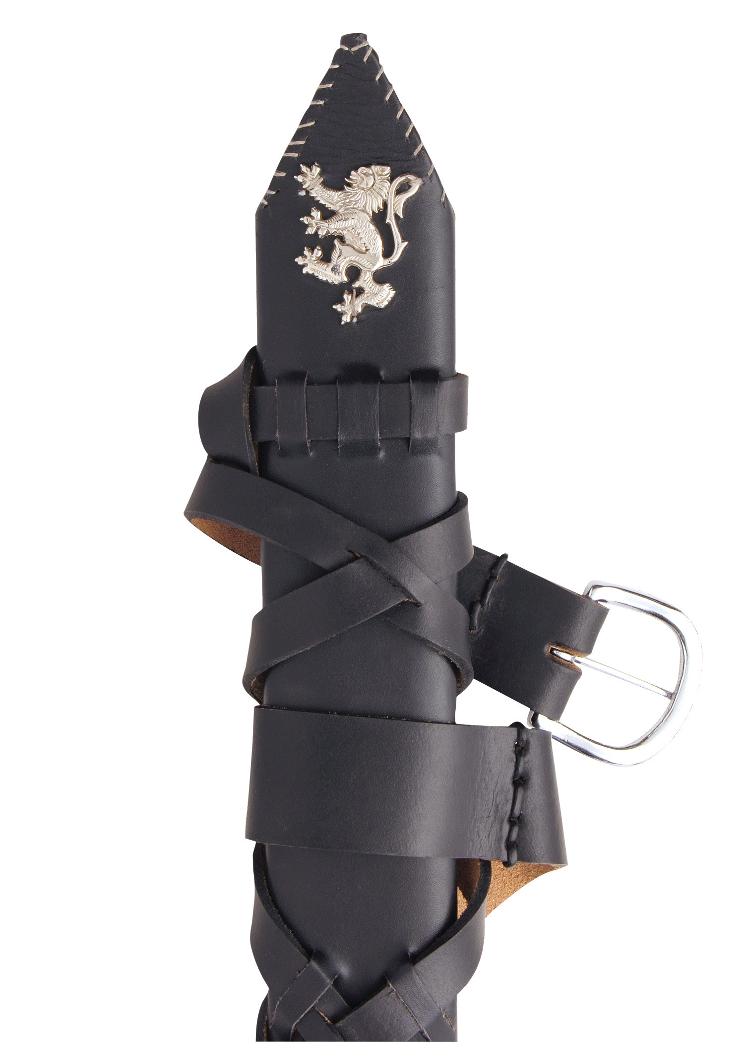 Esta enorme espada vem completa com uma bainha de couro preto grosso combinando com um Leão da Escócia prateado na garganta e um sapato de metal prateado arredondado no dedo do pé. Um prático cinto de couro preto está preso à bainha.