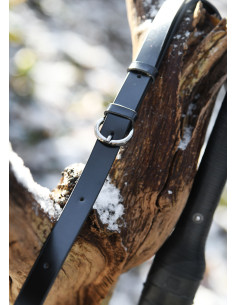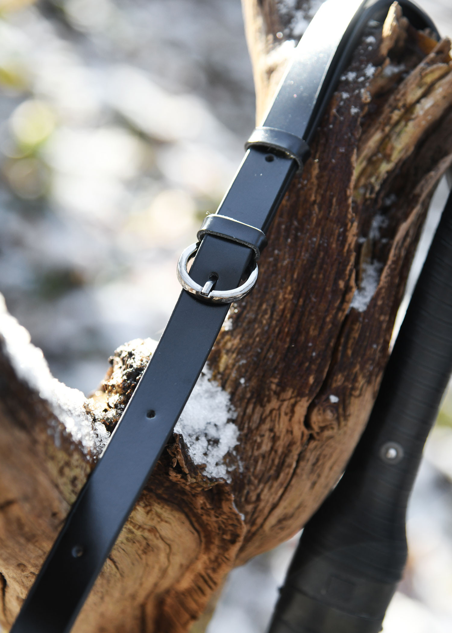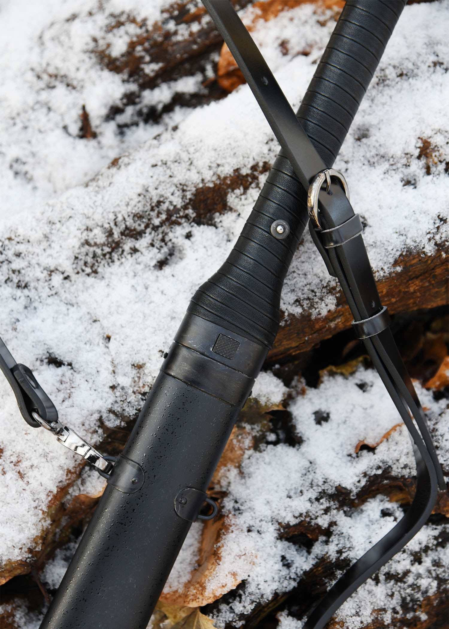 A bainha de madeira da espada Banshee tem acabamento em preto fosco e possui argolas laterais desenhadas para permitir diversas opções de transporte, proporcionando o conforto e praticidade que você precisa.