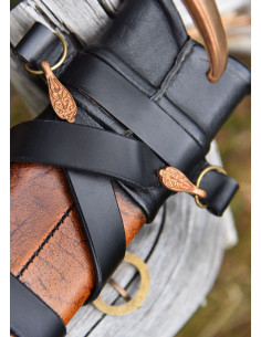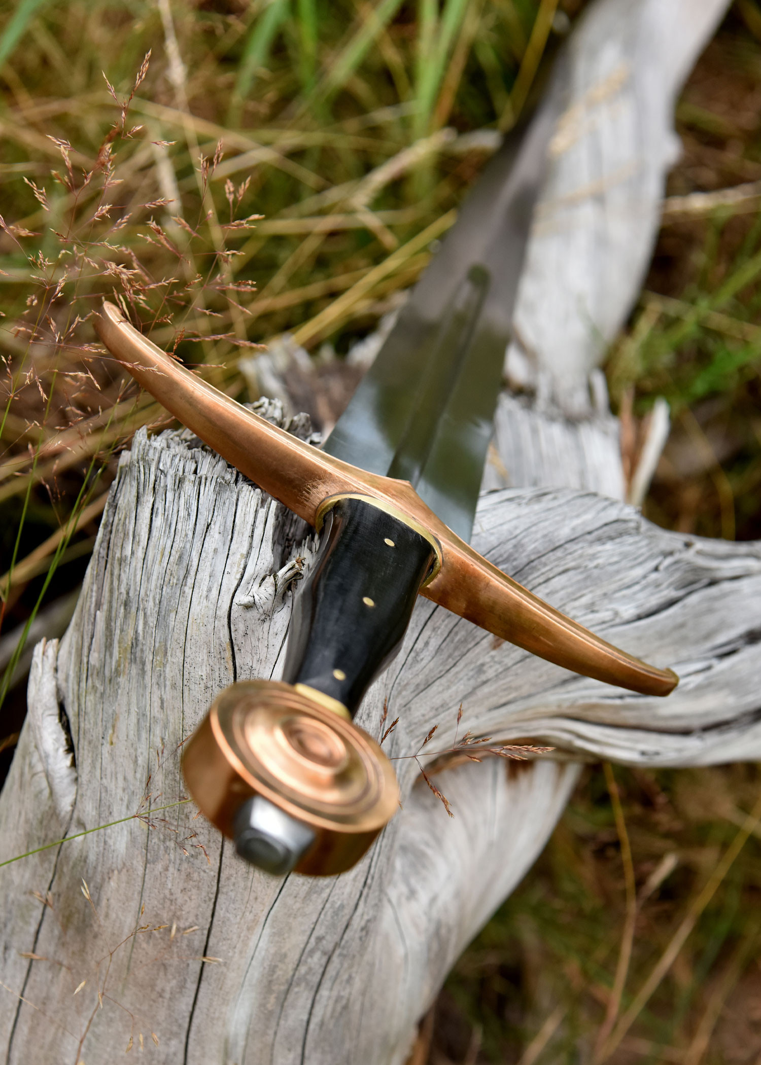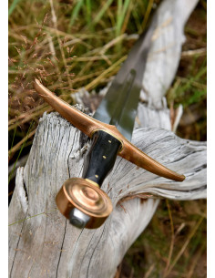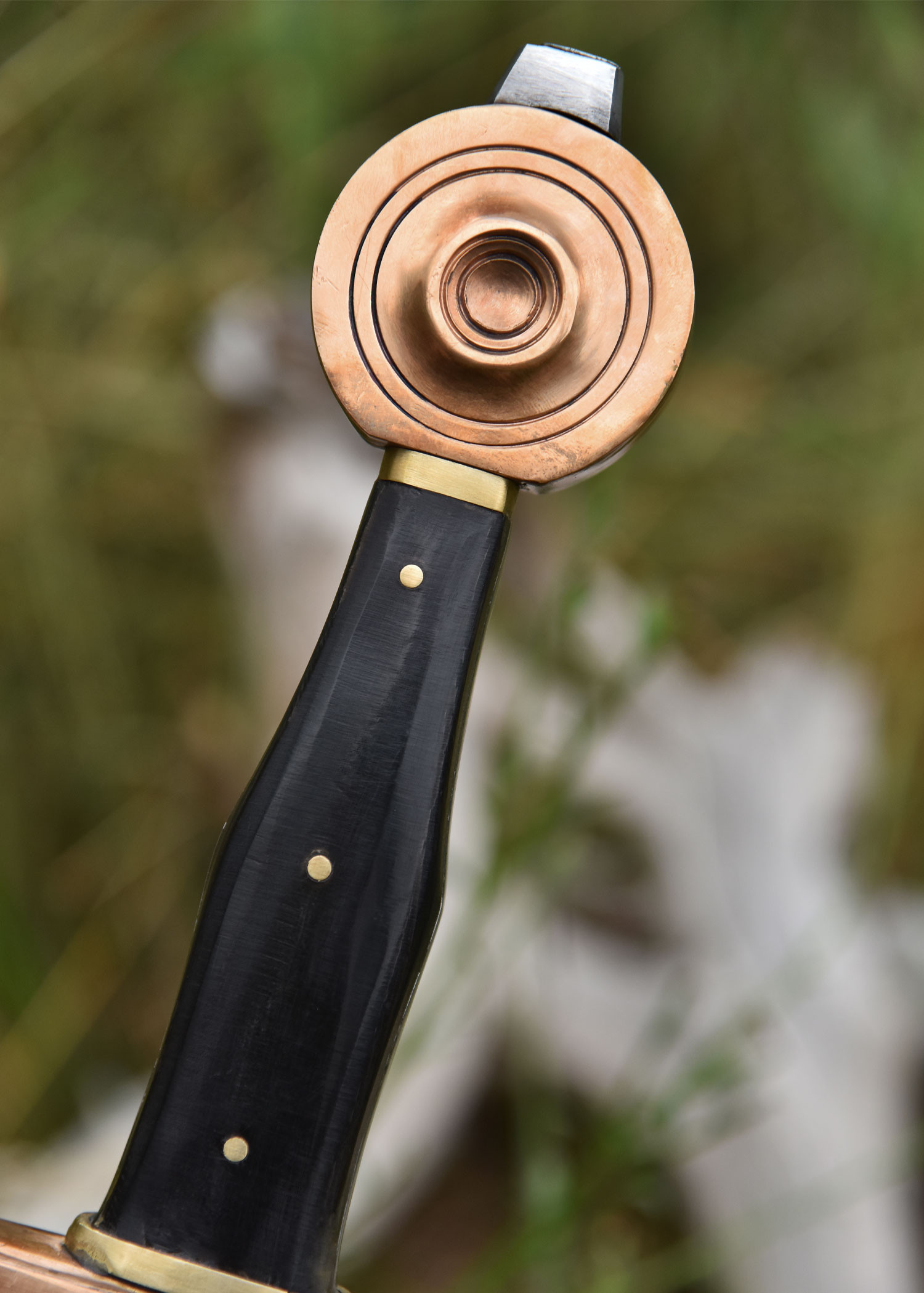 - Design elegante e misterioso: sua lâmina de dois gumes afunila em direção à ponta com um fio mais cheio que percorre um terço de seu comprimento. O cabo, feito de duas escamas de chifre preto, e a guarda curvada em direção à lâmina, assim como o pomo da roda em bronze, acrescentam um toque de mistério e elegância.