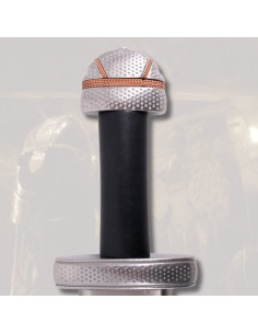 Confeccionada com uma lâmina de aço carbono 1065, possui um acabamento brilhante que garante resistência e eficácia tanto em cortes quanto em estocadas. A empunhadura, revestida em couro, garante uma pegada firme e confortável, enquanto os detalhes decorativos no pomo prestam homenagem ao design viking tradicional. Sua bainha em poliuretano, equipada com ancoragens metálicas, protege a espada e permite transportá-la de forma prática e segura.