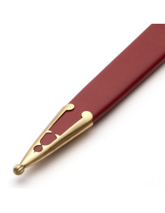 O pomo facetado de latão, além de sua presença marcante, integra um bloco rebitado que estende a espiga, facilitando a desmontagem e futuras intervenções, proporcionando longevidade e adaptabilidade à peça. A combinação de punho e bainha em vermelho com detalhes em latão sugere grau e distinção, oferecendo um acabamento coerente e elegante que protege a espada e se destaca em qualquer exibição.