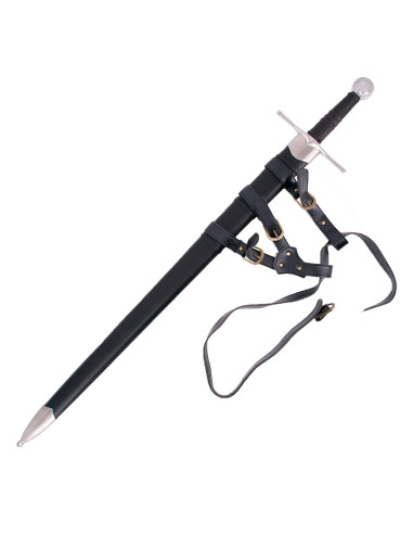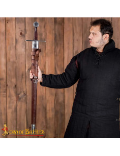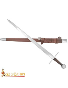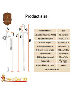 A capa, com revestimento de couro marrom e acabamentos metálicos, protege a peça e facilita o transporte. A alça ajustável com fivela integrada permite levá-la confortavelmente e em segurança no cinto ou no corpo, ideal para recriações, ensaios e exibições. Inspirada nas espadas normandas dos séculos X ao XII, fornece uma conexão visual e emocional com essa época, perfeita para colecionadores e profissionais que valorizam a fidelidade histórica e a funcionalidade.
