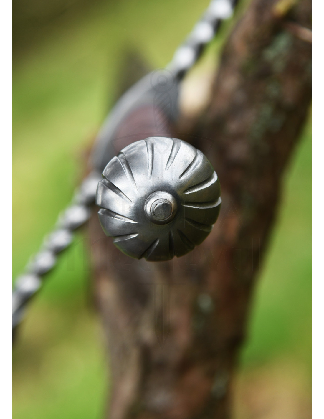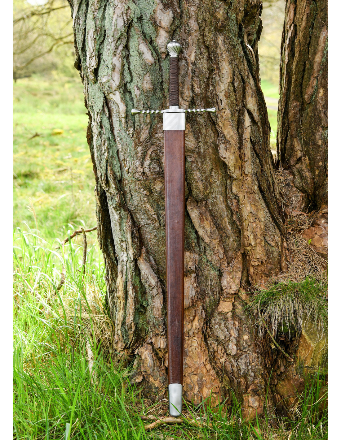 Uma das características mais marcantes desta espada é seu cabo de madeira envolto em couro. Isso não apenas garante uma pegada firme e confortável durante o combate, mas também confere uma aparência autêntica e elegante.