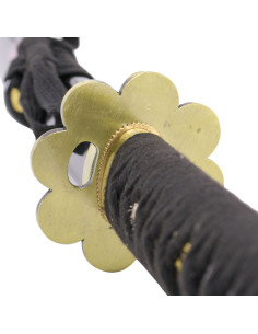 O cabo está envolto em uma corda preta que proporciona uma pegada firme e confortável, com detalhes de imitação de pele de arraia branca que lhe conferem um toque elegante e autêntico.