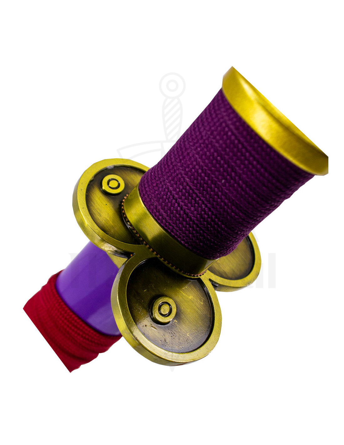 O cabo da katana é envolvido em corda lilás e adornado com detalhes dourados, proporcionando uma pegada segura e confortável, além de um apelo visual que realça sua autenticidade. A bainha, combinando na cor lilás com detalhes dourados e corda vermelha, complementa o design, tornando esta katana uma obra-prima tanto funcional quanto estética.