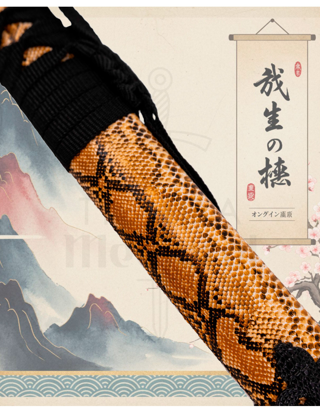 A bainha combina cordura preta resistente com uma capa de imitação de pele de serpente em tons de marrom claro, decorada com desenhos escuros que reproduzem escamas naturais, e fixadores metálicos em preto que garantem uma fixação firme. Essa combinação facilita o transporte e mantém a peça protegida, ao mesmo tempo que reforça sua estética distinta.
