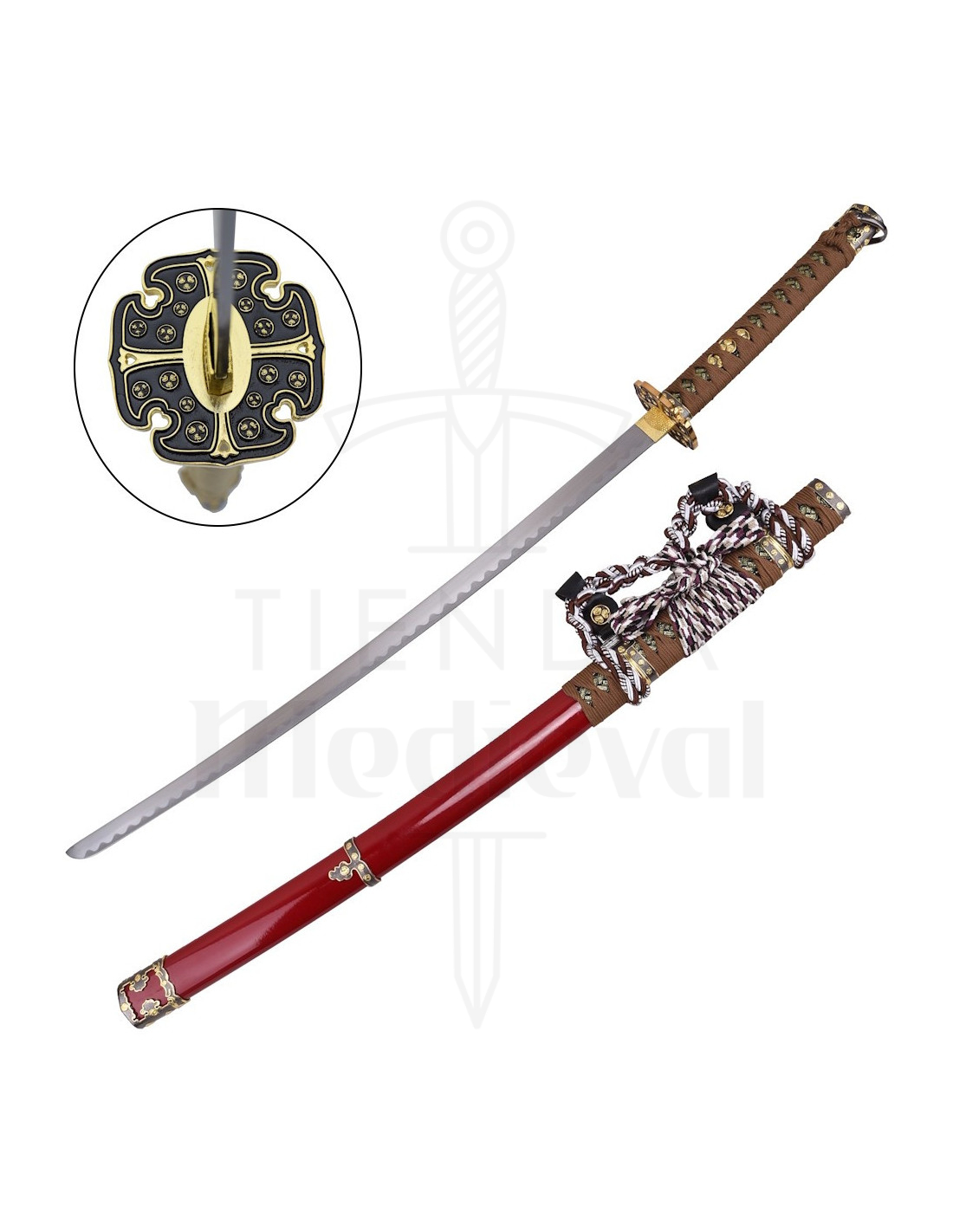 O guardamano pequeno com decoração dourada e preta funciona como detalhe focal, trazendo elegância e continuidade com os acabamentos metálicos da bainha. A bainha em vermelho brilhante, rematada com peças douradas e adornada com um laço trançado em branco, preto e marrom, adiciona contraste e dinamismo, transformando a katana em um objeto ornamental que harmoniza com estilos clássicos e modernos.