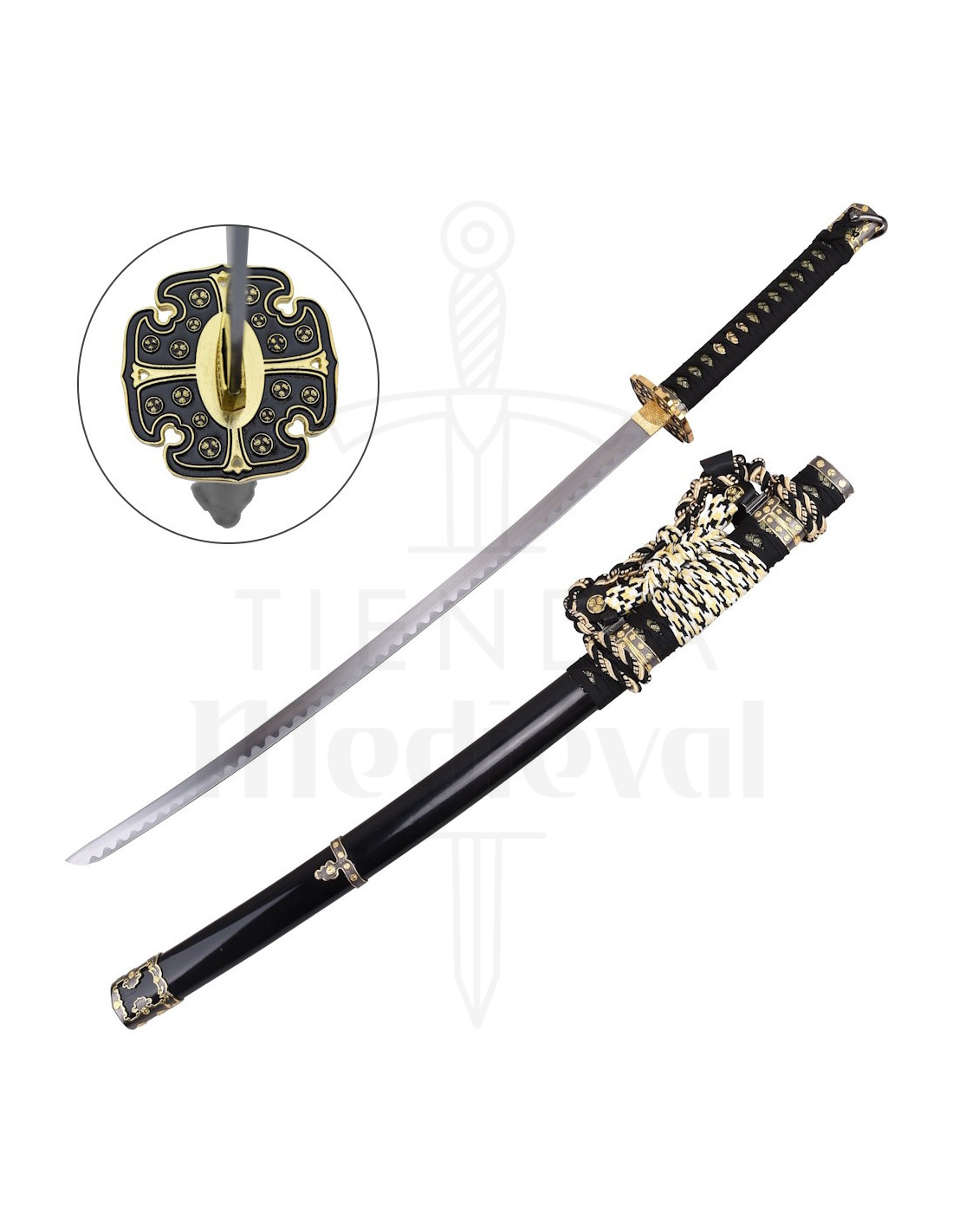 A Katana decorativa Tradicional Japonesa preta, detalhes em latão destaca por um acabamento que transmite autenticidade. A lâmina metálica exibe um padrão ondulado na borda que proporciona profundidade visual e um brilho que capta a luz, ideal para quem busca uma peça decorativa com presença real. O resultado é um objeto que não só embeleza, mas evoca a artesania clássica japonesa.