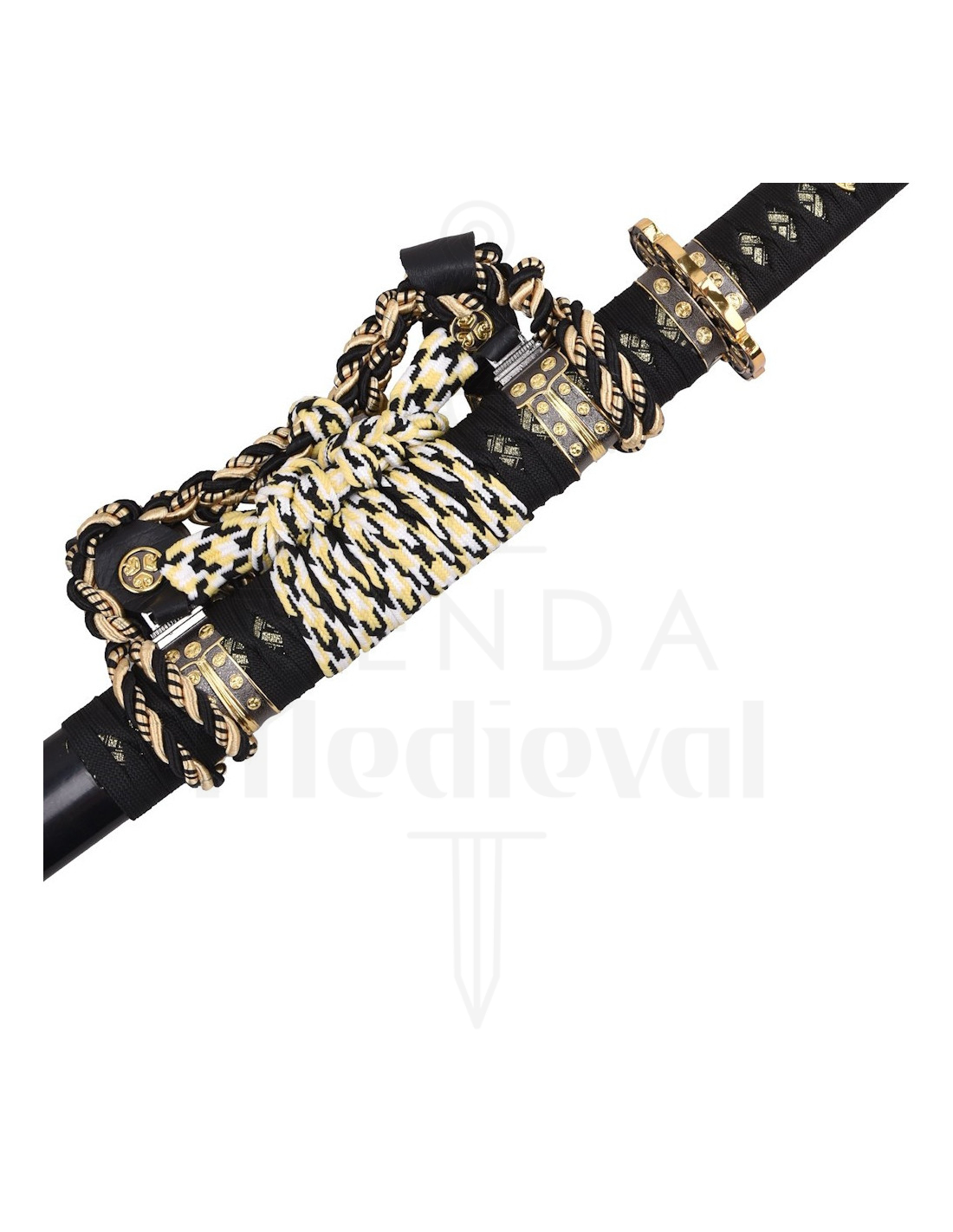 A bainha em madeira preta com acabamentos dourados e a corda trançada em branco, preto e dourado atada em um design ornamental, tornam o conjunto uma peça pronta para exibir. Sua presença em uma parede, sobre um suporte, ou como peça principal em uma vitrine, traz personalidade sem necessidade de adicionar elementos adicionais. É prática para montar e é apreciada tanto em ambientes modernos quanto em decorações de inspiração asiática.