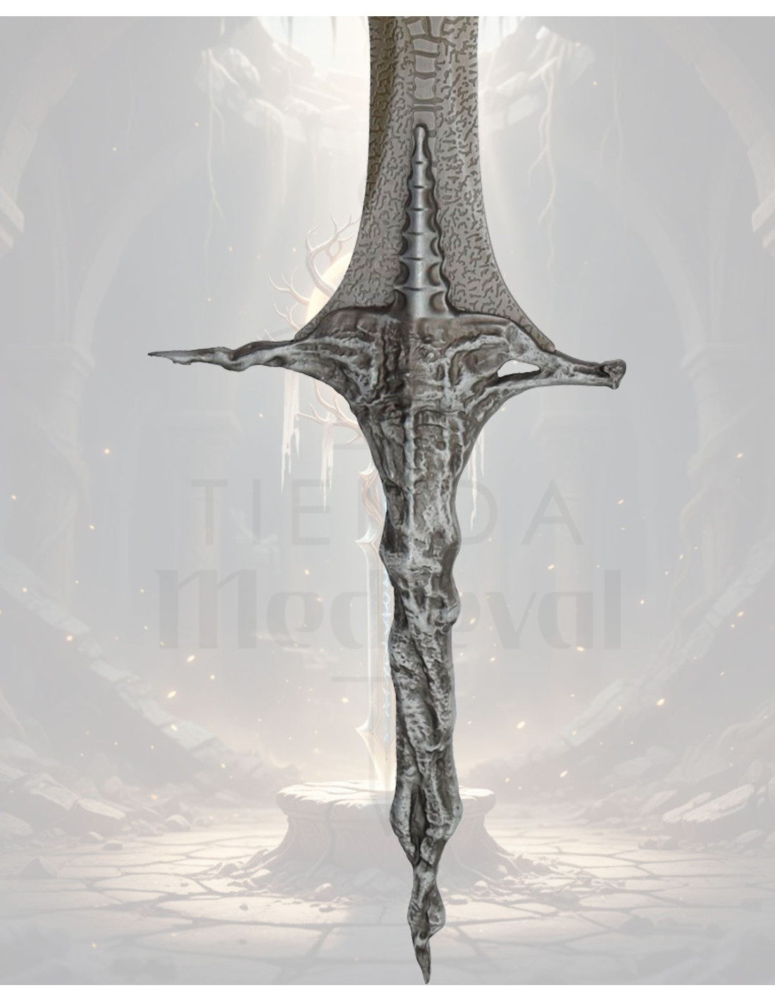 Os buracos ovais ao longo da lâmina e o punho com detalhes texturizados acrescentam personalidade, fazendo com que a peça não só chame a atenção, mas também convide a observá-la de perto. Essa silhueta irregular e o extremo pontiagudo no punho reforçam sua aparência forjada, ideal para quem procura uma réplica com caráter e fidelidade estética.