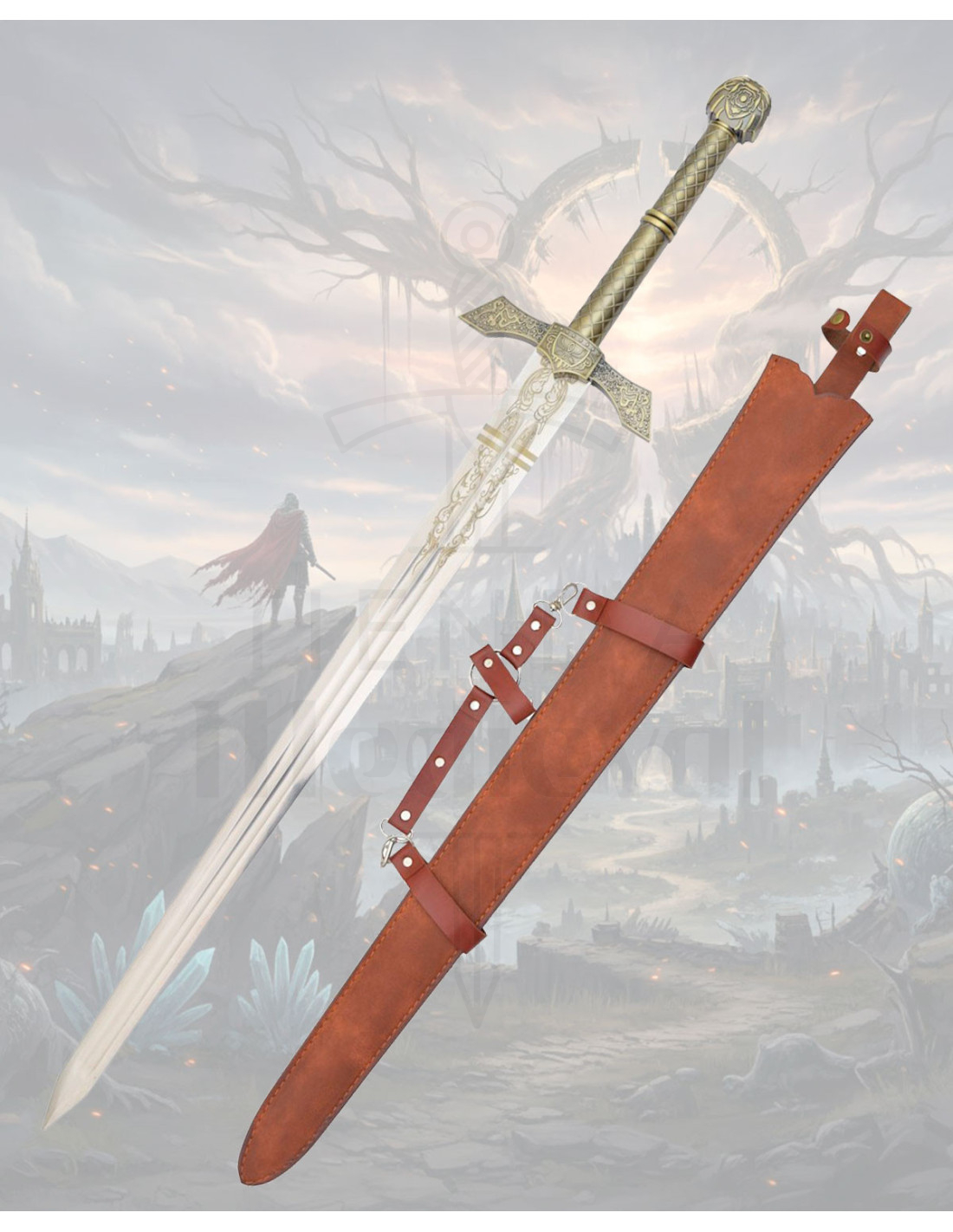 A guarda larga, também em acabamento dourado decorado, não apenas reforça a estética imponente, mas também equilibra visualmente a peça, dando a impressão de uma espada forjada para um cavaleiro de lenda. A capa em couro marrom com costuras visíveis e tiras ajustáveis facilita transportá-la e garantir seu fechamento com fecho metálico, ideal para quem busca uma peça que combine exibição e funcionalidade prática.
