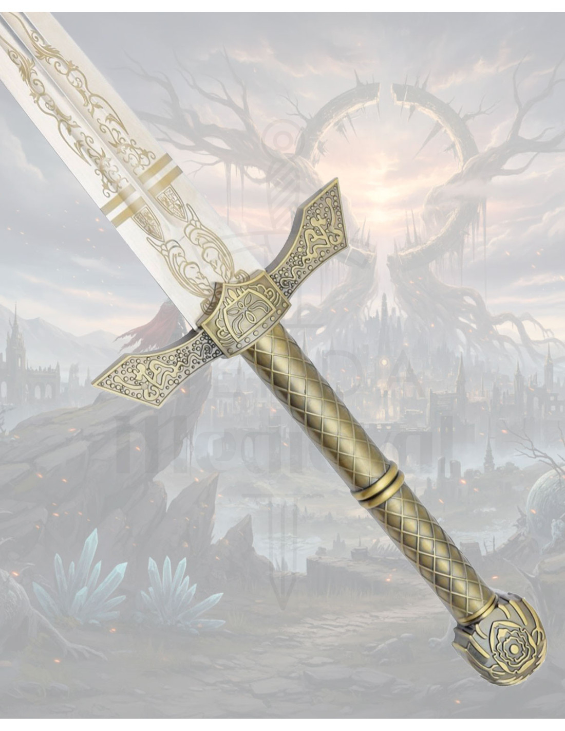 Com uma lâmina metálica de dois gumes e gravações ornamentais em seu centro, esta réplica transmite autenticidade e presença sem exigir experiência no manuseio, perfeita para exibir na parede ou acompanhar um traje de evento. O cabo dourado, com um padrão entrelaçado que lembra losangos e um pommel com relevo floral, oferece uma empunhadura que parece feita para se sentir orgulhoso ao segurá-la, trazendo uma sensação de qualidade e refinamento.