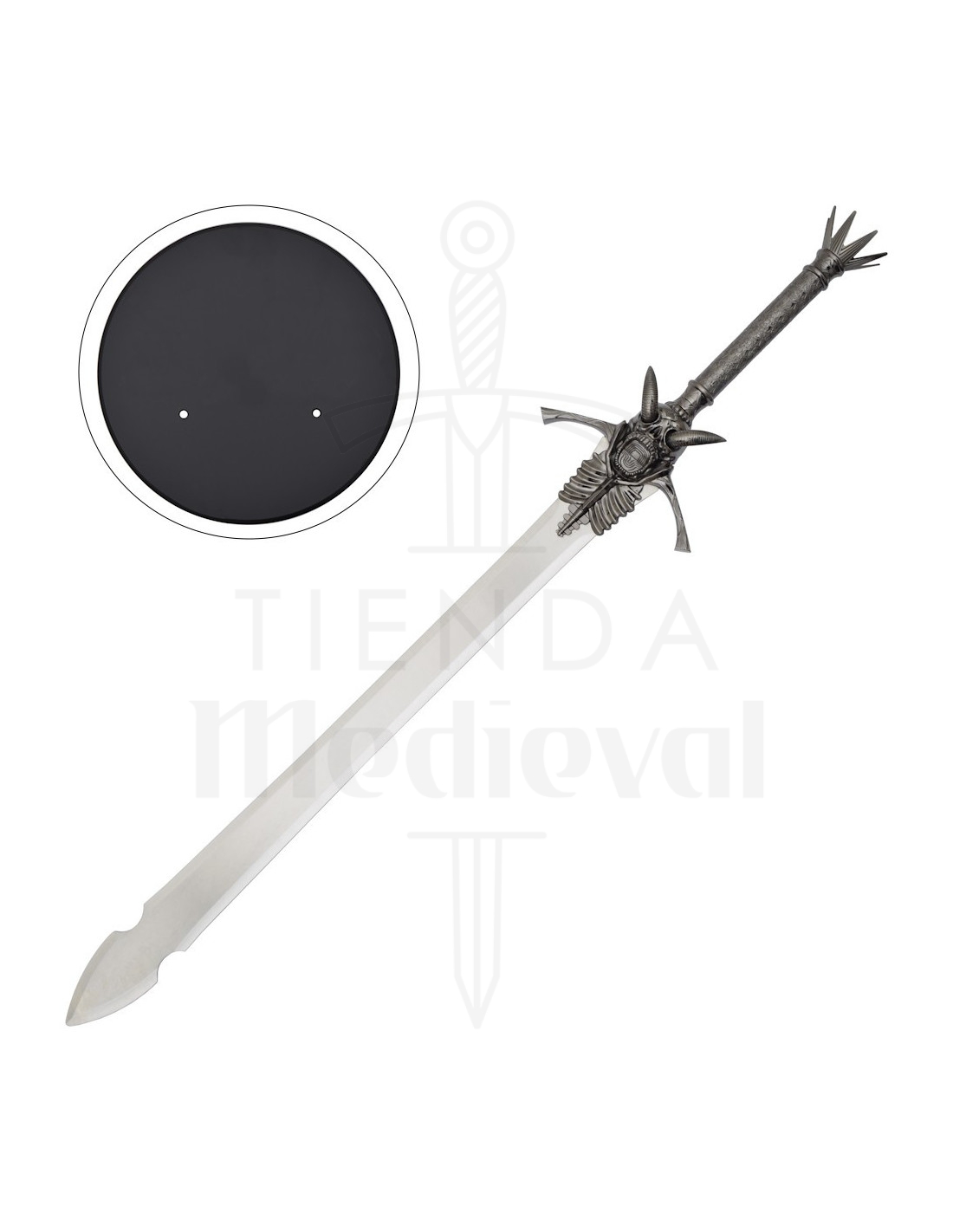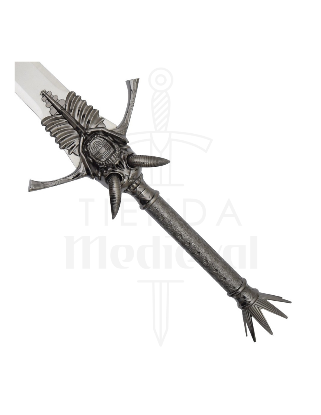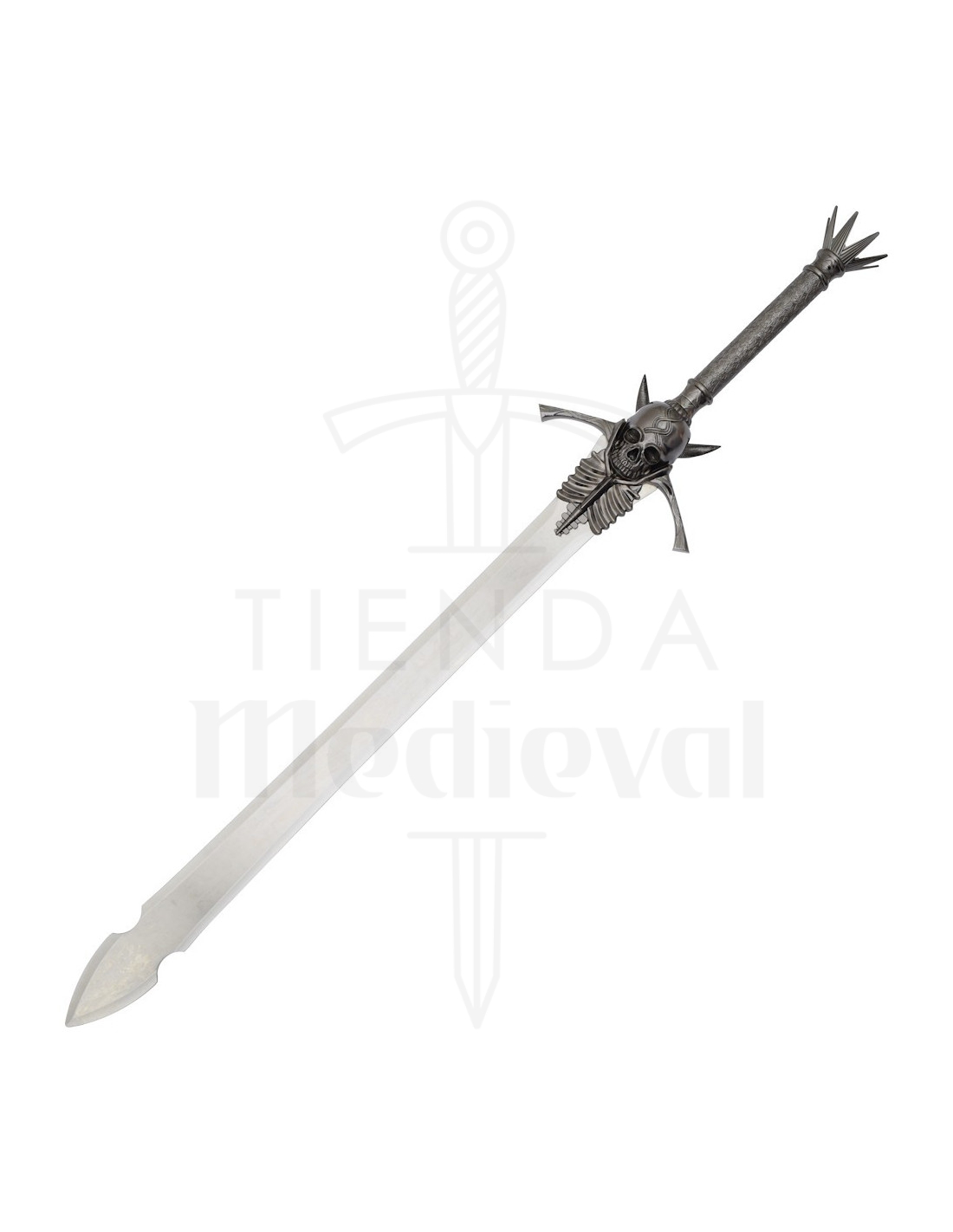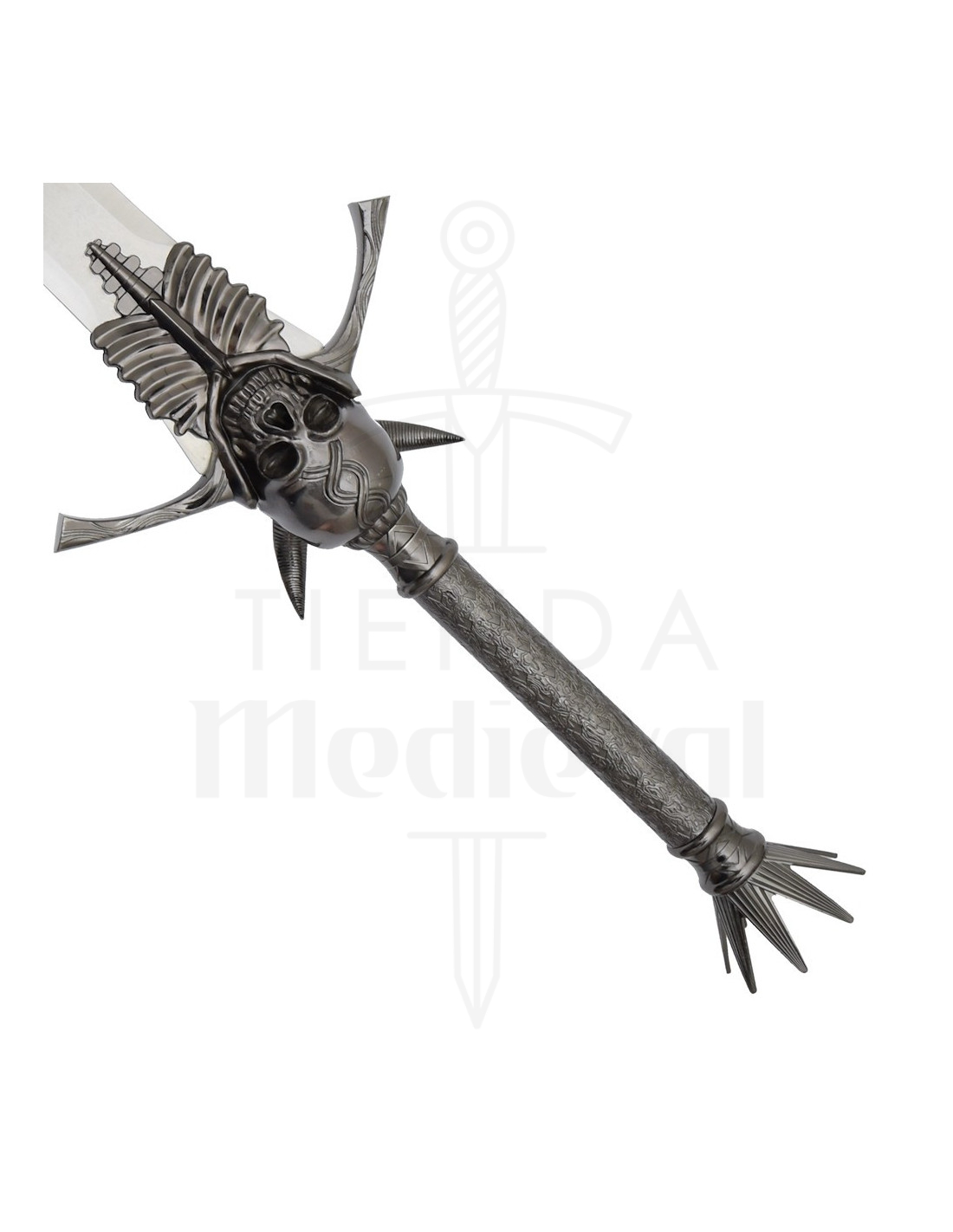 O design não é apenas estético, também facilita a experiência: a empunhadura escura e texturizada oferece um agarre firme para posá-la ou segurá-la com segurança, enquanto a guarda decorada com caveira e costelas, e os espinhos laterais, dão caráter e uma sensação teatral que realçam cada foto ou display. A coroa de espinhos na ponta do punho adiciona aquele acabamento dramático que define seu estilo gótico e decorativo.