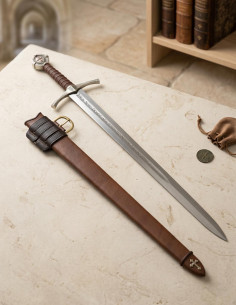 Com a sua lâmina de aço carbono 1065, esta espada foi forjada para resistir a qualquer desafio, proporcionando-te uma experiência de manuseio perfeita: equilíbrio, velocidade e precisão. O seu design não é apenas bonito, é já uma extensão da tua vontade, permitindo-te exibir força e controlo em cada movimento. A bainha de couro resistente e a fita de época oferecem-te transporte sem complicações, enquanto o pomo com moeda templária e a pega forrada a couro vermelho confirmam a autenticidade e o carácter aristocrático do Cavaleiro Templário. Esta peça, chamada Accolade, é o teu passe para a história, o teu símbolo de autoridade num mundo onde só os fortes permanecem.