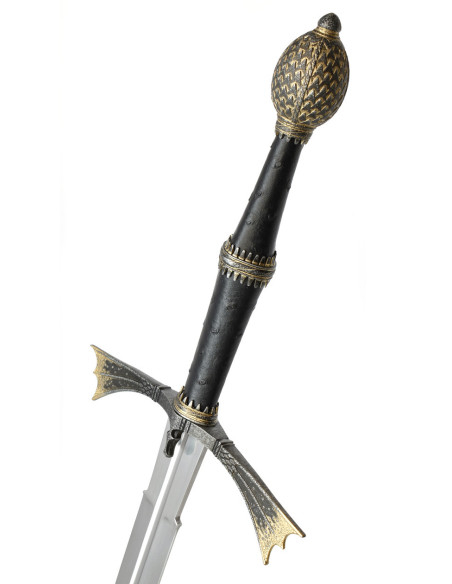 A guarda curvada, finalizada em tons dourados ou bronze com uma aparência texturizada, acrescenta um ar régio, enquanto o punho escuro, acentuado por dois anéis decorativos em dourado ou bronze, oferece um equilíbrio visual que faz a peça se destacar contra qualquer fundo. O pomo ovalado, com relevo, fecha o conjunto trazendo coerência estética e uma finalização fiel aos designs vistos na tela.