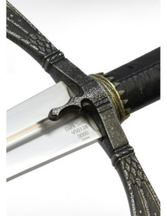 A lâmina, de filo duplo com um canal central que percorre grande parte de sua extensão, confere uma silhueta refinada e um brilho que realça cada detalhe, criando um contraste elegante com a guarda. Essa combinação transmite imediatamente uma sensação de nobreza e distinção, pensada para ser exibida e admirada de qualquer ângulo.