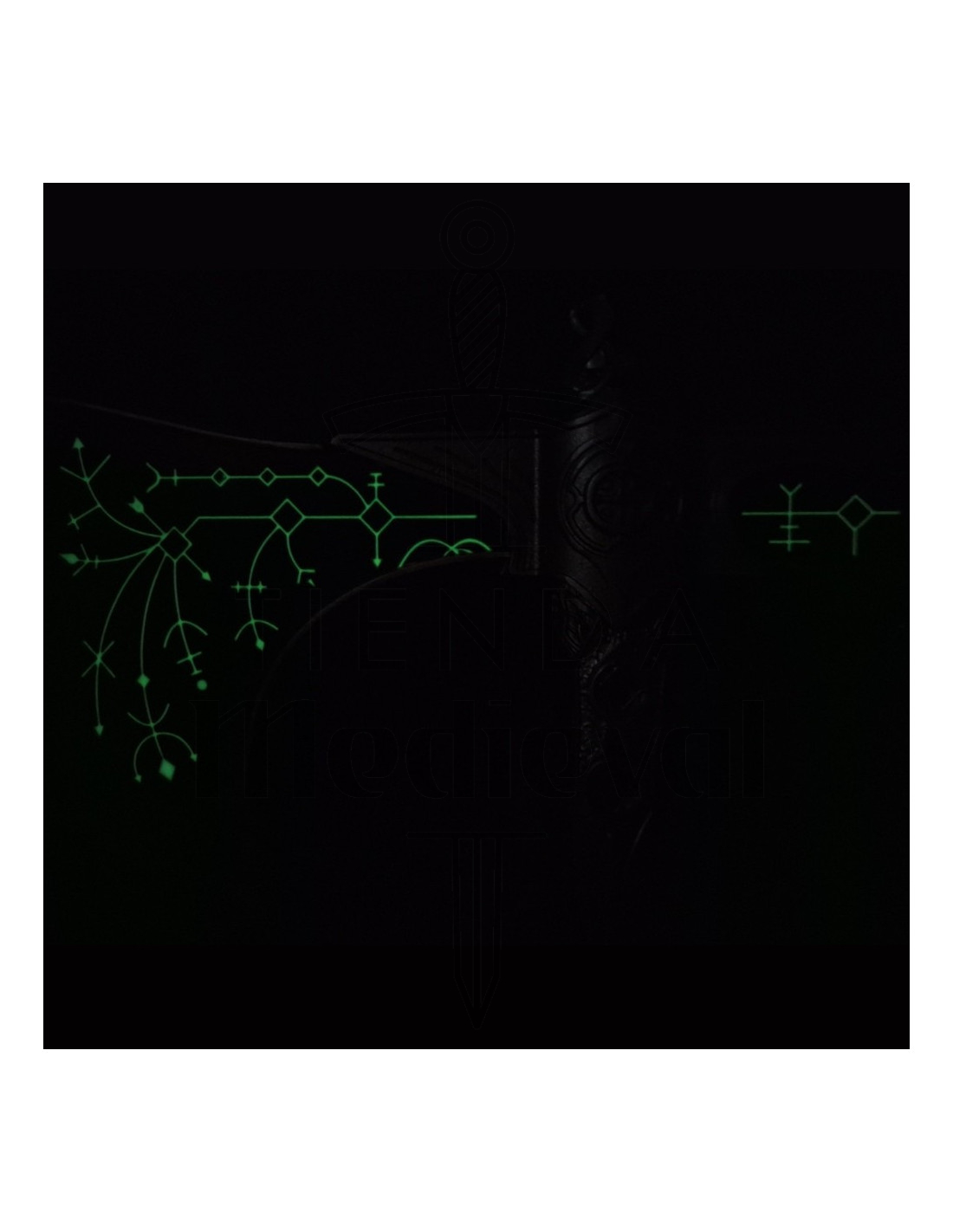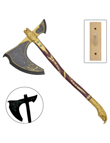 Este machado captura olhares graças a uma lâmina ampla em tons de preto e dourado, salpicada com nuances azul esverdeadas e ornamentos geométricos, criando um efeito dinâmico e profundo. O acabamento fosco e os gravados em prata destacam as linhas, enquanto os detalhes fluorescentes oferecem um brilho sutil quando a luz diminui, tornando-o um ponto focal de admiração tanto de dia quanto de noite.
