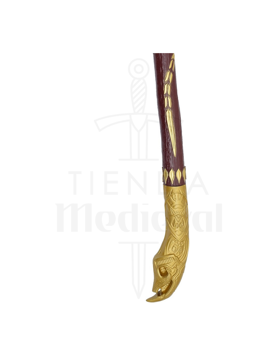 O cabo, de tom marrom escuro com relevos e terminações douradas, não é apenas decorativo, mas também oferece uma sensação de solidez e equilíbrio que transmite qualidade ao toque. O fecho em forma de cabeça estilizada acrescenta um toque escultural que reforça a presença heroica do objeto, ideal para quem valoriza peças com personalidade e narrativa visual.