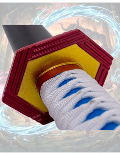 O cabo envolto em tecido branco com detalhes em azul garante uma pegada confortável e segura, enquanto a guarda e o acabamento em vermelho escuro aportam contraste elegante e equilíbrio visual. As gravuras douradas perto da guarda, junto com as cores branco, azul, vermelho e preto, destacam a precisão do design e o estilo do personagem.