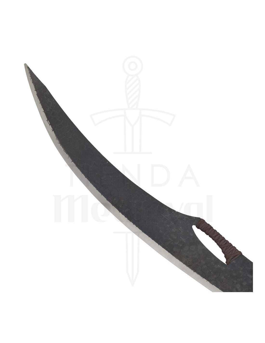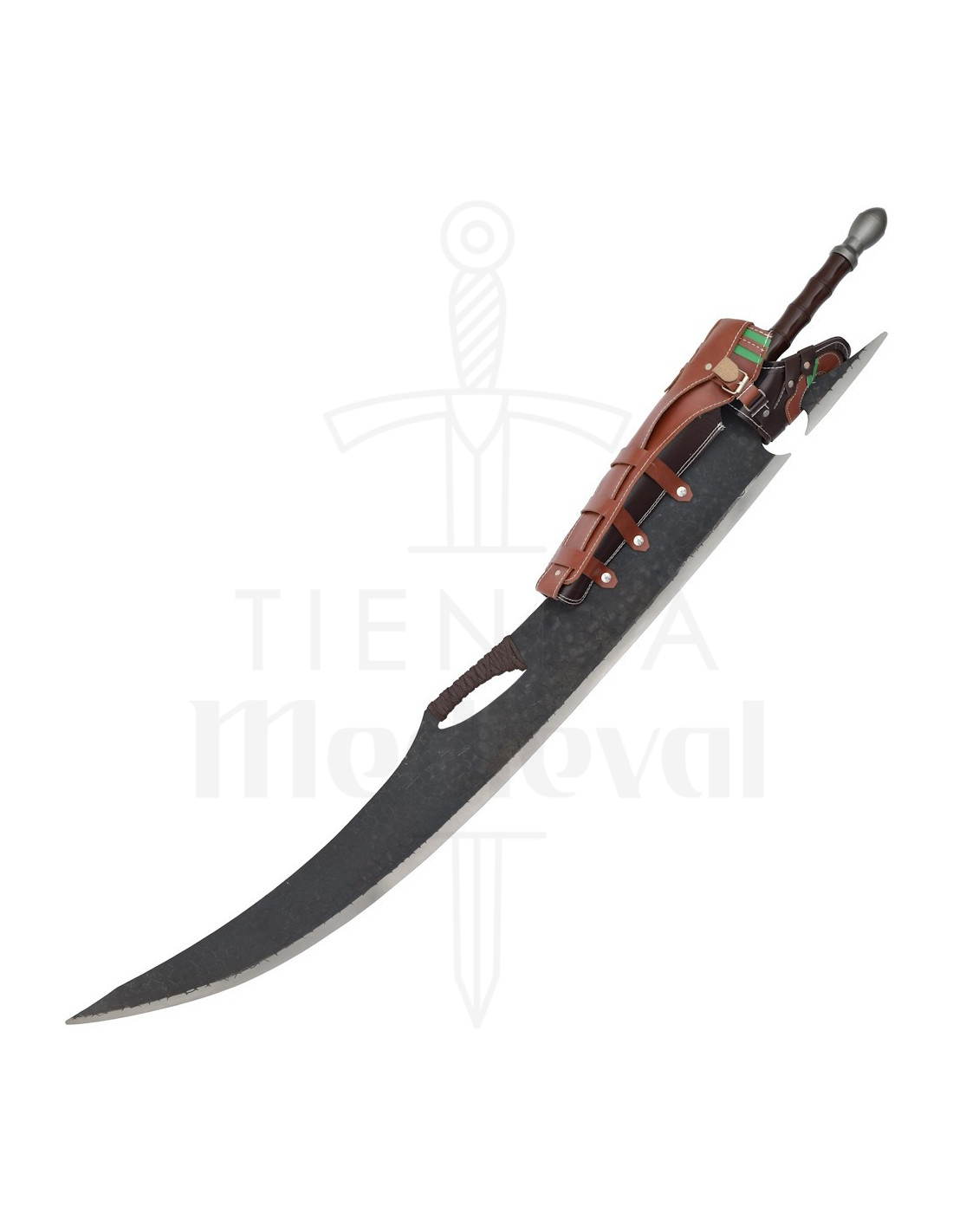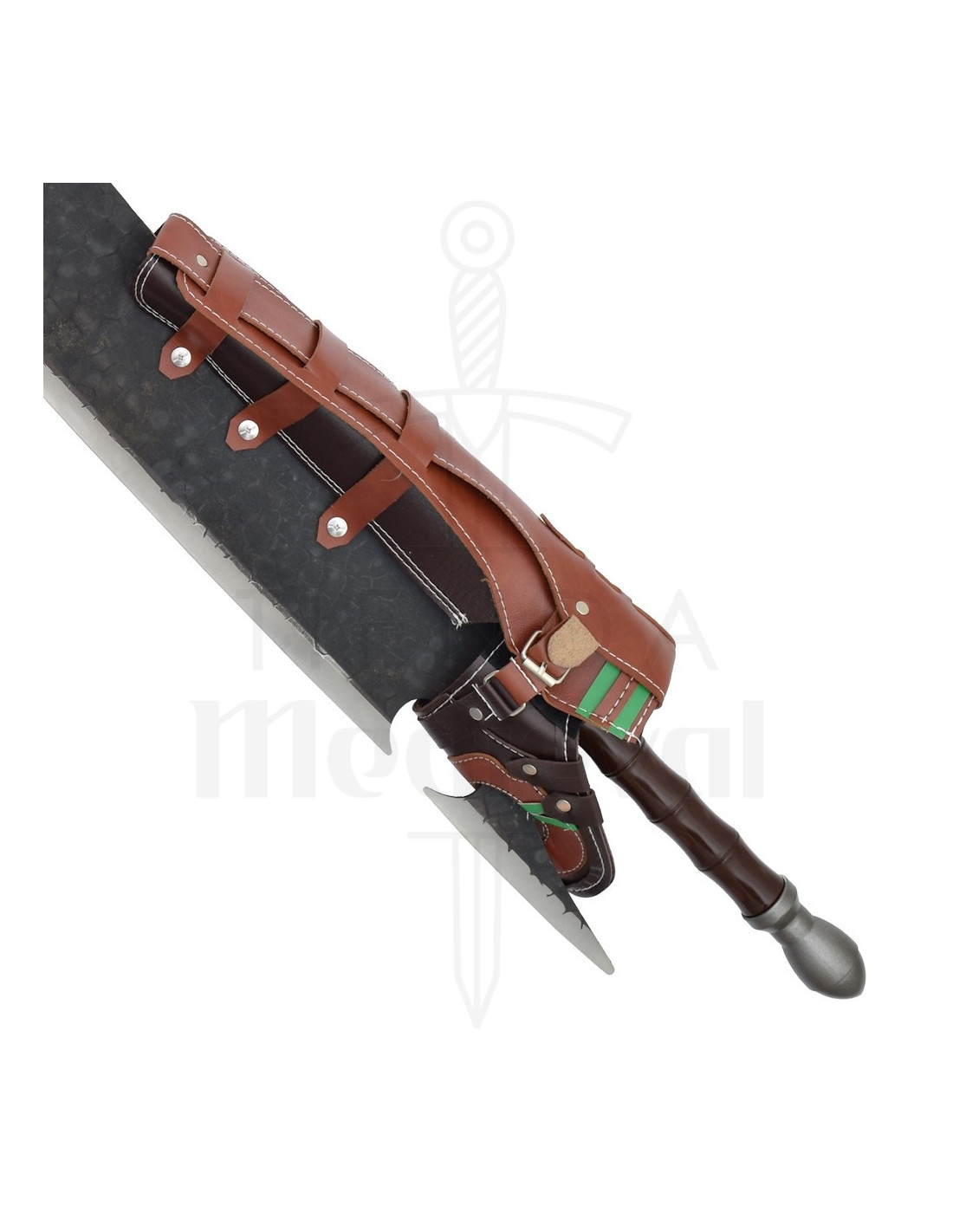 Com um design que respeita a estética do jogo, esta réplica oferece uma presença imponente sem comprometer a segurança, graças à sua lâmina cega projetada exclusivamente com fins ornamentais. Essa aparência metálica texturizada em preto e a abertura decorativa ao lado do cabo conferem autenticidade visual, enquanto as partes em corda e couro sintético adicionam caráter e realismo ao conjunto.
