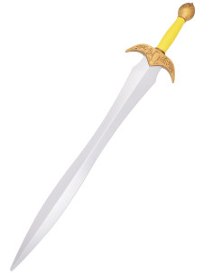 A Aelinor destaca-se pelo seu acabamento cuidadoso e seu equilíbrio pensado para o combate recreativo e o espetáculo, permitindo movimentos fluidos sem renunciar a uma aparência imponente. Sua lâmina com acabamento prateado e nervo central proporciona um brilho e uma linha que capturam a atenção em cada impacto, enquanto a guarda ornamentada em tom dourado acrescenta o ar heroico que você busca para seu papel.