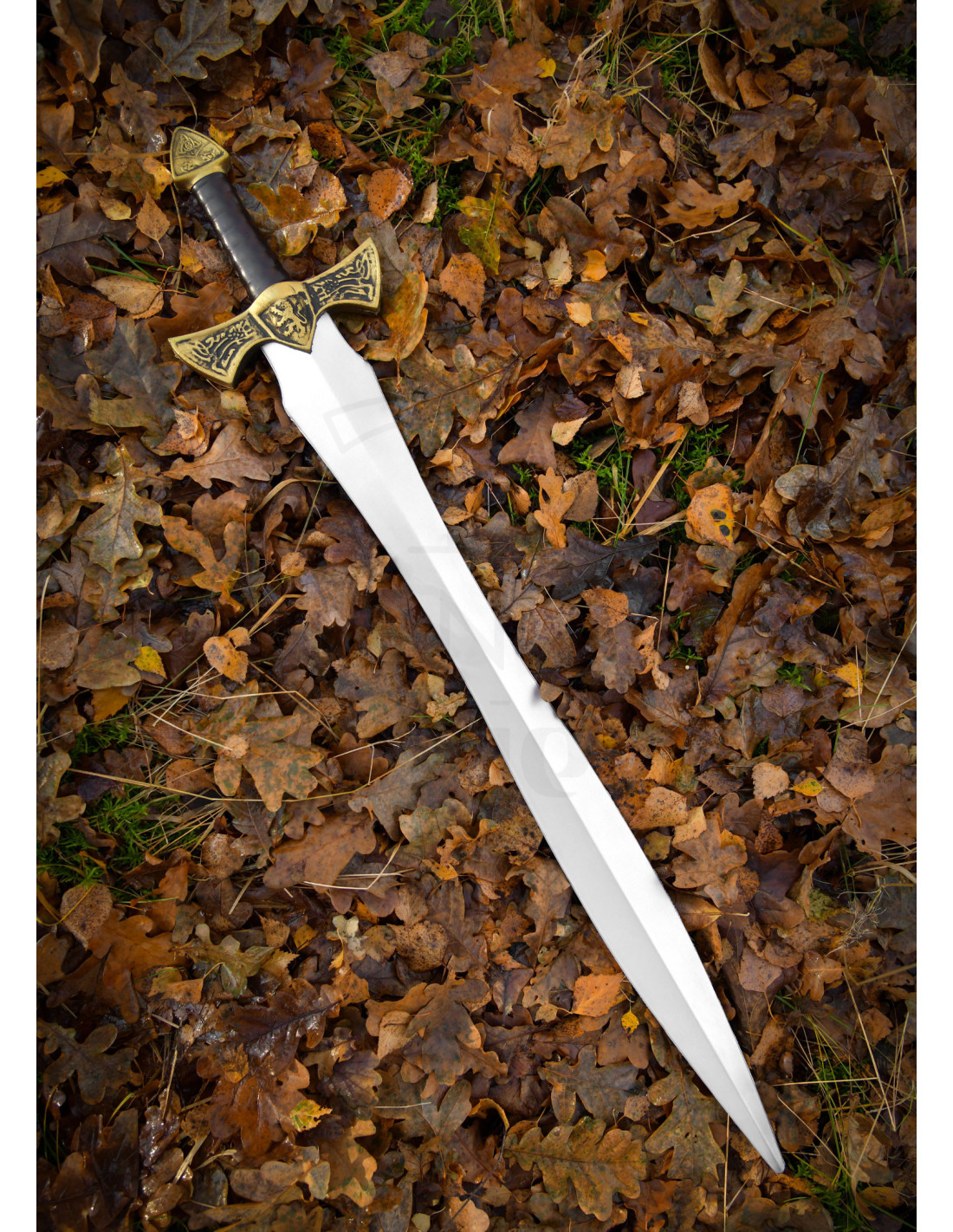 Os detalhes dourados na guarda e no pomo, com relevos elegantes e uma guarda curva para cima, elevam qualquer personagem: desde um cavaleiro que defende os seus, até um guerreiro endurecido que impõe respeito. A combinação de cores —lâmina prateada, cabo escuro e detalhes dourados— combina com armaduras e trajes diversos, realçando sua presença em fotos, cenas ou campos de jogo.